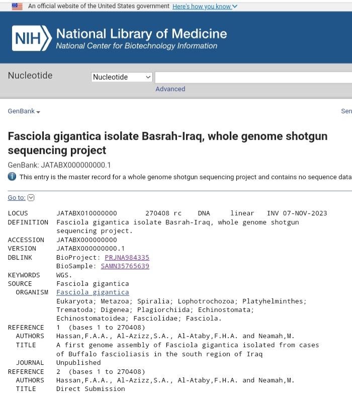 It is worth noting that this project was the nucleus of the graduation research of veterinarian Fatima Al-Zahraa Aqeel, and it was developed, the entire parasite was deciphered, and it was registered in the Global Gene Bank to rank No. 13 in the world and first internationally, and this is according to what the results showed with the NCBI Global Gene Bank.