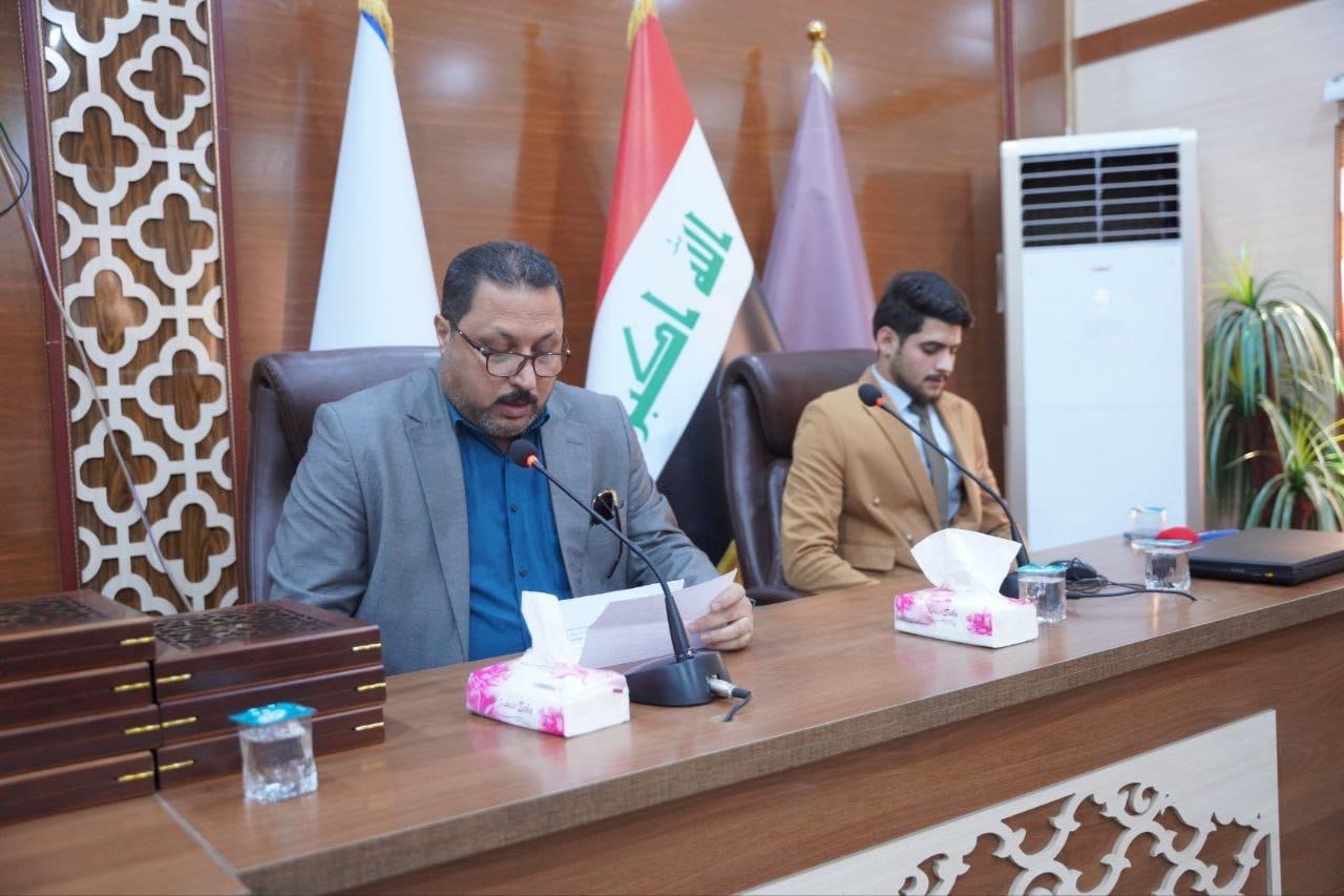 The conference opened its proceedings with a fragrant recitation of the Holy Qur’an, followed by the national anthem, then the reading of Surat Al-Fatihah for the souls of the martyrs of Iraq. Then, the Dean of the College delivered the opening speech of the conference, which included an overview of the college and its most important achievements. The first axis of the conference included the scientific aspect presented by the respected Assistant Dean for Scientific Affairs, Professor Dr. Abdul-Sattar Jaber Ali, who provided a detailed explanation of this aspect that included a research approach in which a group of scientific activities that the college seeks to achieve were presented and discussed, and this is evident in evaluating the scientific process. For the college in the future by identifying the most important positive indicators of that process and the most important distinguished activities in the college from the calendar year and comparing them with its achievements in previous years in order to work to develop these indicators for the better in line with scientific and research progress in the corresponding colleges.