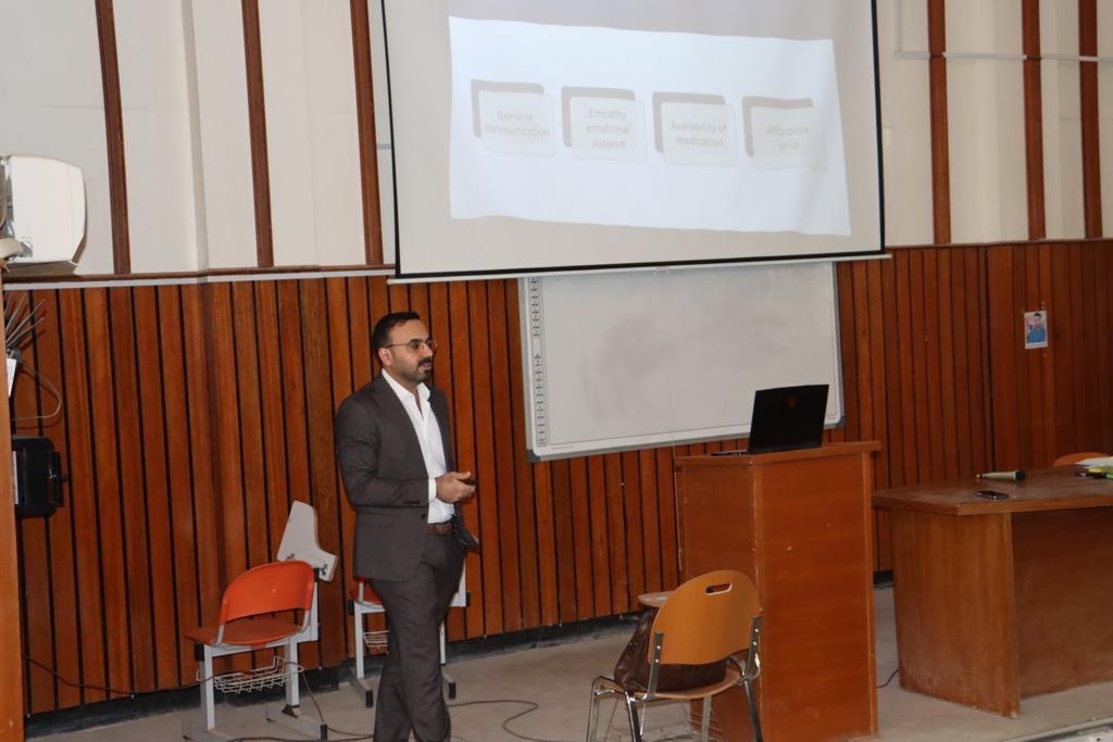 The College of Pharmacy at University of Basrah, under the supervision of the Center for Rehabilitation, Employment and Follow-up at University of Basrah, organized a workshop (Draw your practical steps). The workshop included a lecture by the teacher, Ali Muhammad Al-Rawaq, aimed at introducing students to job prospects after graduation, whether working in the field of pharmaceutical media, pharmacies, cosmetic products, or electronic marketing companies, and how to hone their skills and information in every aspect of work and employ them to launch the professional side. The lecture also discussed the positive and negative factors that affect the patient's personality and how to avoid negative matters The lecture also showed the latest studies that aim to develop skills in the field of time management and life matters according to priorities, physical and auditory communication skills, the importance of each aspect and its impact on others, as well as persuasion skills in all its methods.