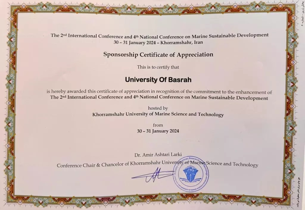 College of Marine Sciences at University of Basrah participated in the Fourth National and Second International Conference on Sustainable Marine Development, held by Khorramshahr University of Science and Technology in the Republic of Iran. The Dean of the College of Marine Sciences, Dr. Osama Qasim Khalifa, and Dr. Nawras Abdul-Ghani, the teaching assistant at College of Marine Sciences, participated in the activities of the scientific conference held at the Khorramshahr University of Marine Science and Technology based on the invitation submitted by the University of Khorramshahr. Dr. Osama Qasim gave the opening speech at the conference about introducing the attendees to the College and Center of Marine Sciences at the University of Basrah and its scientific and research potential, which received attention and appreciation from the academics and experts participating in the conference. The participants assumed the presidency and membership of the scientific committees to manage the practical conference sessions. On the sidelines of the conference activities, researchers exchanged ideas and visions about the possibility of scientific cooperation and conducting joint scientific research between the two sides.