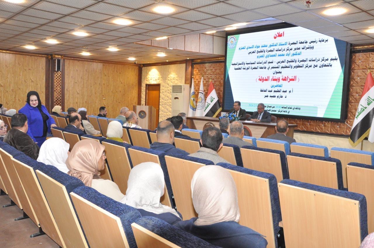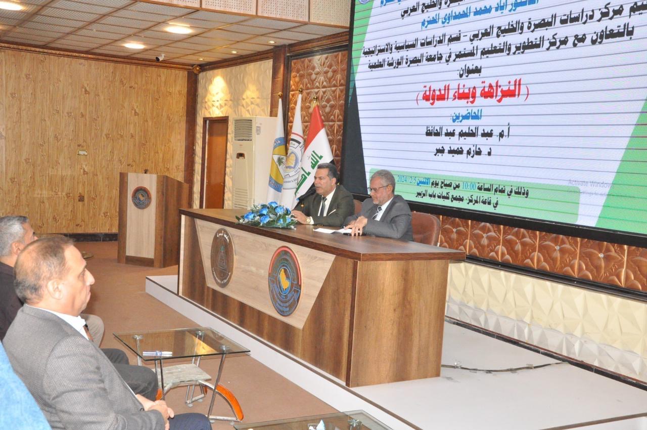 The Center for Basrah and Arabian Gulf Studies, in cooperation with the Center for Development and Continuing Education at the University of Basrah, organized the scientific workshop entitled Integrity and State Building. The lecturers stressed the importance of establishing the concepts and values of integrity in the hearts of citizens to reduce all types of corruption, achieve development and stability for Iraqi society, and strengthen ties of trust between citizens and state institutions so that Iraq can enjoy prosperity and security.