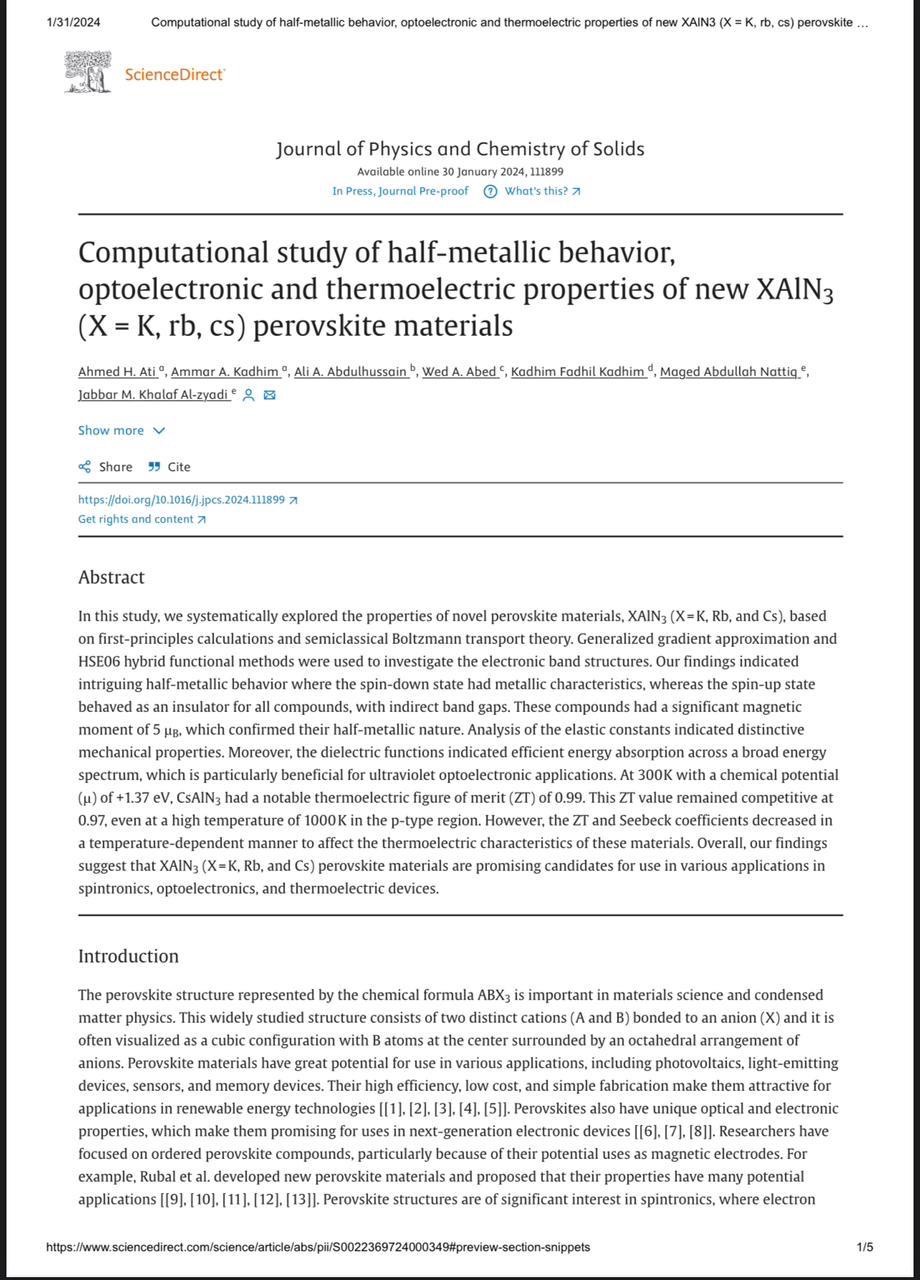 A research team from University of Basrah, College of Education, Qurna, lecturer Ahmed Hamad, lecturer Ammar Abdel-Jabbar, and lecturer Kazem Fadel published a research entitled computional study of half-metallic behavior optoelectronic and thermoelectric properties of new XAlN3 (X=K, rb, Cs) perovskites materials In the Journal of Soil Physics and Chemistry Among the Scopus and Clarvit containers within the second quarter, Q2, with an impact factor of 4 and cite score=7 The results showed that these materials are characterized by a half-metallic characteristic, which is due to the large magnetic moment they possess. They also possess distinctive elastic properties. Considering the energy gap located in one of the two electron spin channels, its optical properties were studied and it was found that it has a significant impact on the energy range of the ultraviolet region. These materials have also proven effective in thermoelectric behavior in the P-type region at temperatures up to 1000K, which is essential in designing materials for thermoelectric devices. Perovskite materials are promising candidates for use in various applications in the fields of spintronics, optoelectronics, and thermoelectric devices.
