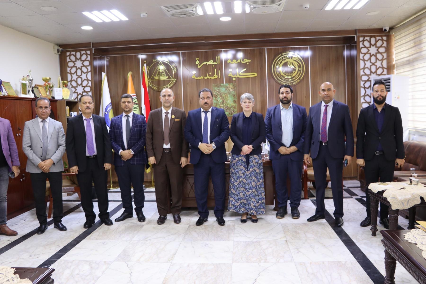 College of Engineering at University of Basrah received a delegation from Al-Nahrain Network at University College London, Department of History. The delegation was represented by Director of the Al-Nahrain Network, Professor Elinor Robson, and she was accompanied by Mr. Mahyar Abd. The visit coincided with the visit of the President of University of Basra, Professor Dr. Muhannad Jawad Kazem, to College of Engineering. The delegation was received by Dean of the College of Engineering, Dr. Mufid Turki Rashid, Assistant Dean for Administrative Affairs, Dr. Sarmad Abdullah Abbas, Assistant Dean for Student Affairs, Dr. Adeed Habib Taha, and Assistant Dean for Scientific Affairs. Professor Dr. Mounir Abdel Jalil and Head of the Department of Architecture, Dr. Hamid Hayab Samir, discussed during the meeting topics related to visual heritage and the mechanism of advancement in visual architecture. The visit aims to strengthen relations between the London College and the College of Engineering and extend bridges of cooperation between the two universities. These meetings come within the framework of the continued keenness to open up to international networks and universities.