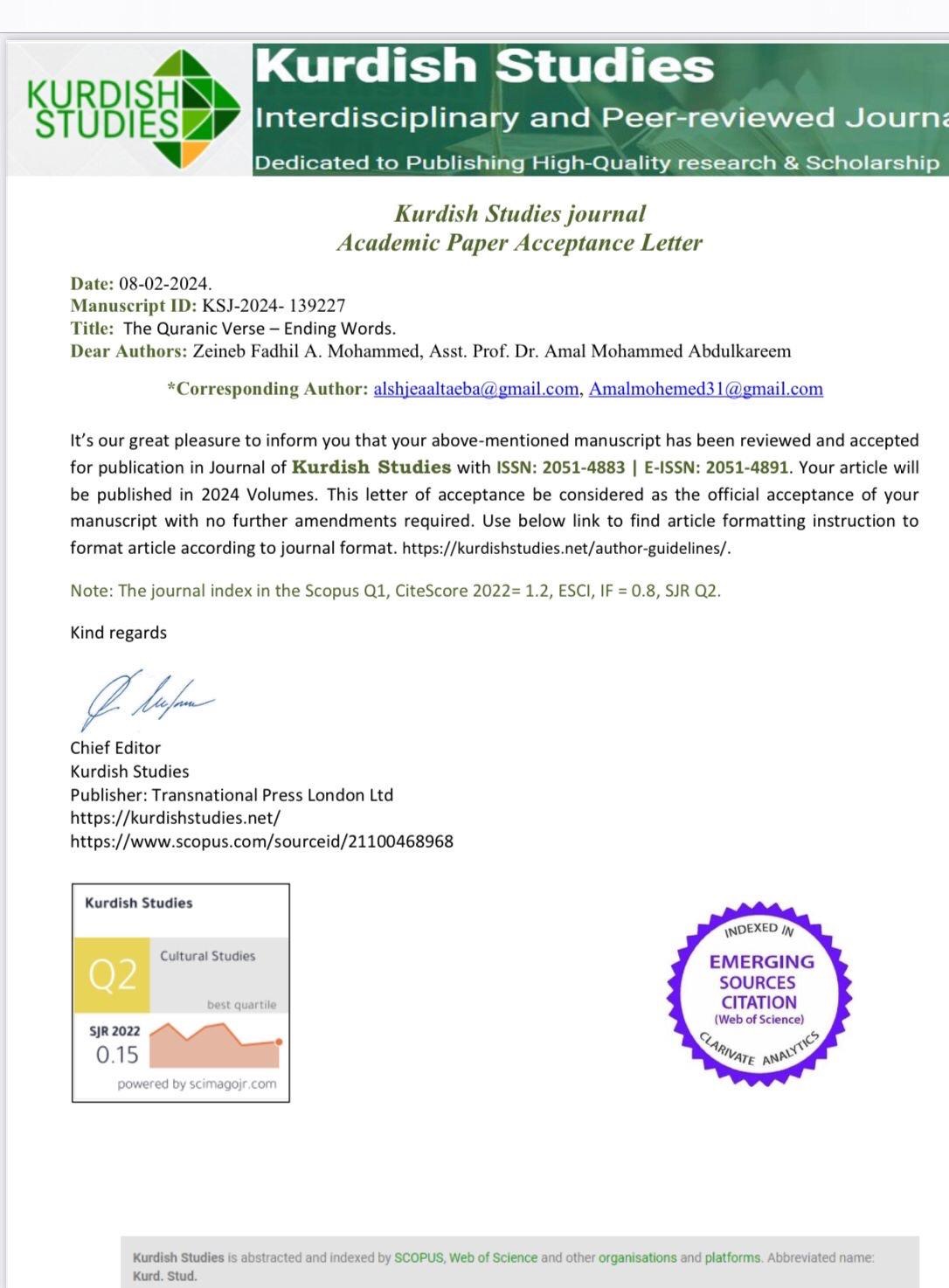 Department and Dean of College of Education for Girls, Dr. Amal Muhammad Abdel Karim, along with researcher Zainab Fadel Abbas, published a research in a magazine within the Scopus database entitled: “The Quranic Verse - Ending Words” The research dealt with explaining the role of the comma, which is one of the aspects of the Qur’anic miracle, where the reader stops at it because he feels the completeness of the meaning. It is also one of the most important rules of the rhythmic formation of the Holy Qur’an. The research touched on the fact that scholars, ancient and modern, have paid great attention to the comma.Because of its importance in achieving vocal balance and rhythmic harmony, and standing on the comma achieves a kind of recitation that the soul enjoys and soothes the hearing. The research adopted the analytical approach that penetrates deep into the subject, analyzes all aspects, and provides the best results.