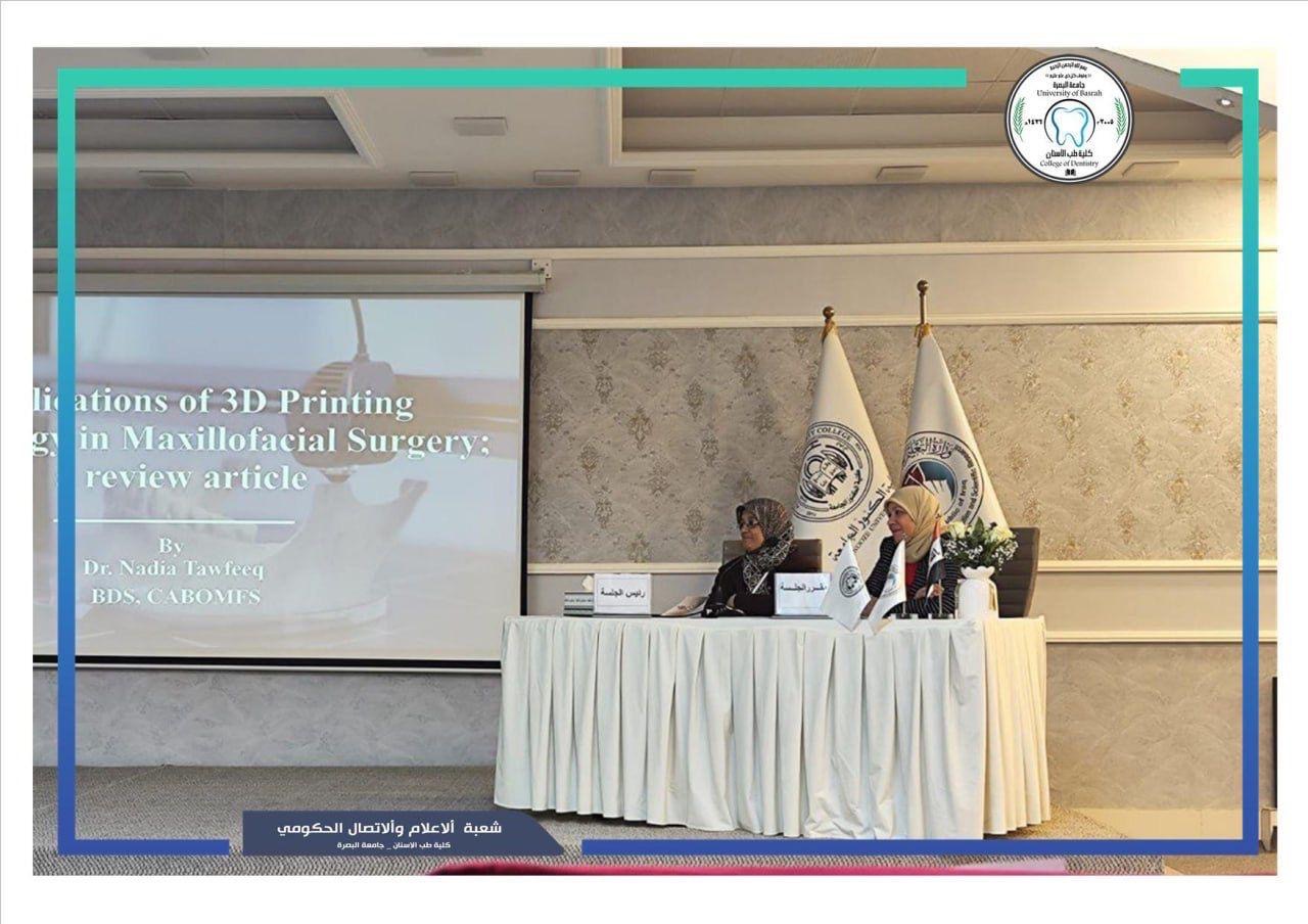 Two female teachers from College of Dentistry at Basrah University manage the scientific session at Second International Scientific Conference for Medical Sciences of Al-Kunoz University College .The goal of holding the conference, which came under the slogan “Future Shines Toward a Better Health Reality for the Iraqi People,” is to adopt scientific research projects to be a scientific beacon and also to enhance the talents of college students and discover their potential and skills in creative and scientific thinking to make decisions and control the skills of the basics of scientific research. The conference came up with recommendations that would contribute to the development of various fields of medical sciences, and constitute a qualitative addition to the higher education sector at the level of Basrah Governorate, and provide a valuable opportunity for transferring and exchanging experiences.