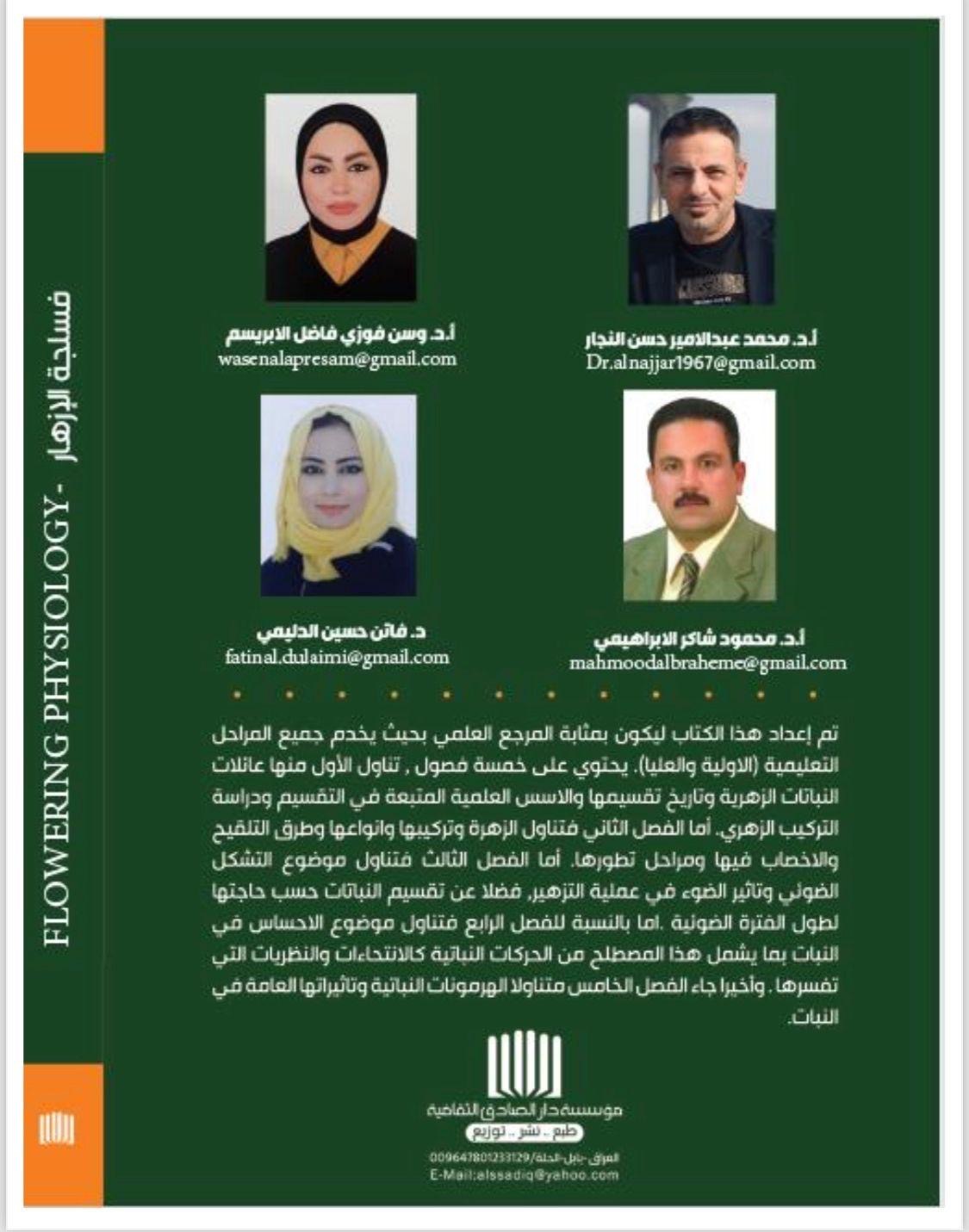 The second book was issued by professors at the University of Basra, College of Agriculture, Department of Horticulture and Landscape Engineering, Professor Dr. Muhammad Abd al-Amir Hassan al-Najjar, Professor Dr. Wasan Fawzi Fadel al-Ibrasim, Professor Dr. Mahmoud Shaker al-Ibrahimi from Dhi Qar University, and Assistant Professor Dr. Faten Hussein al-Dulaimi from the University of Baghdad, entitled (Flower Physiology). Physiology) This book was prepared to serve as a scientific reference to serve all educational levels (primary and higher). This book contains five chapters, the first of which deals with the families of flowering plants, the history of their division, the scientific foundations used in the division, and the study of flower structure. The second chapter deals with the flower, its composition, types, methods of pollination and fertilization, and the stages of its development. As for the third chapter, it dealt with the topic of photomorphogenesis and the effect of light on the flowering process, as well as dividing plants according to their need for a long photoperiod. As for the fourth chapter, it dealt with the topic of sensation in plants, including this term, including plant movements such as tropism and the theories that explain them. Finally, the fifth chapter dealt with plant hormones and their effects. General in the plant, especially the flowering process .