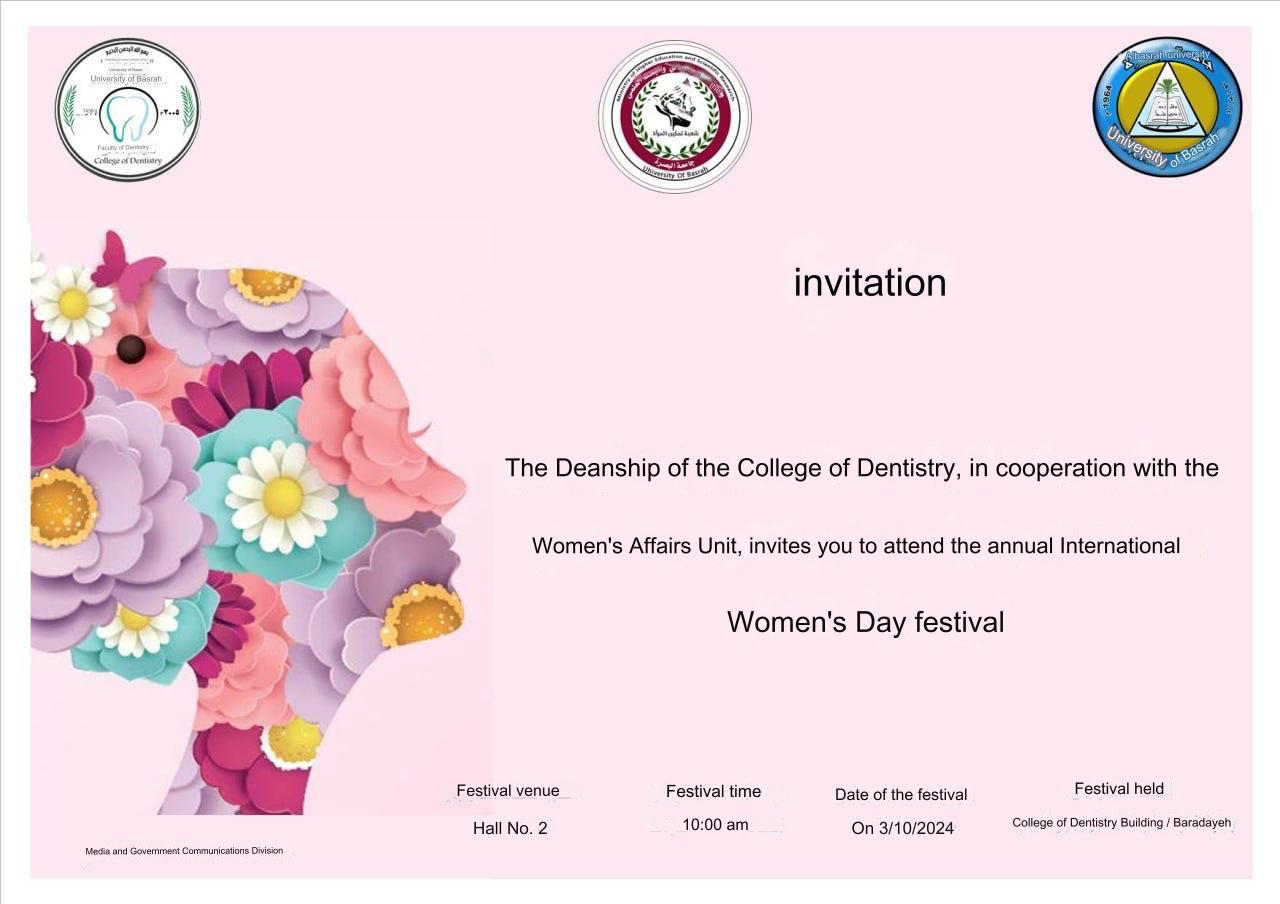 The Deanship of the College of Dentistry, in cooperation with the Women's Affairs Unit, invites you to attend the annual International Women's Day festival