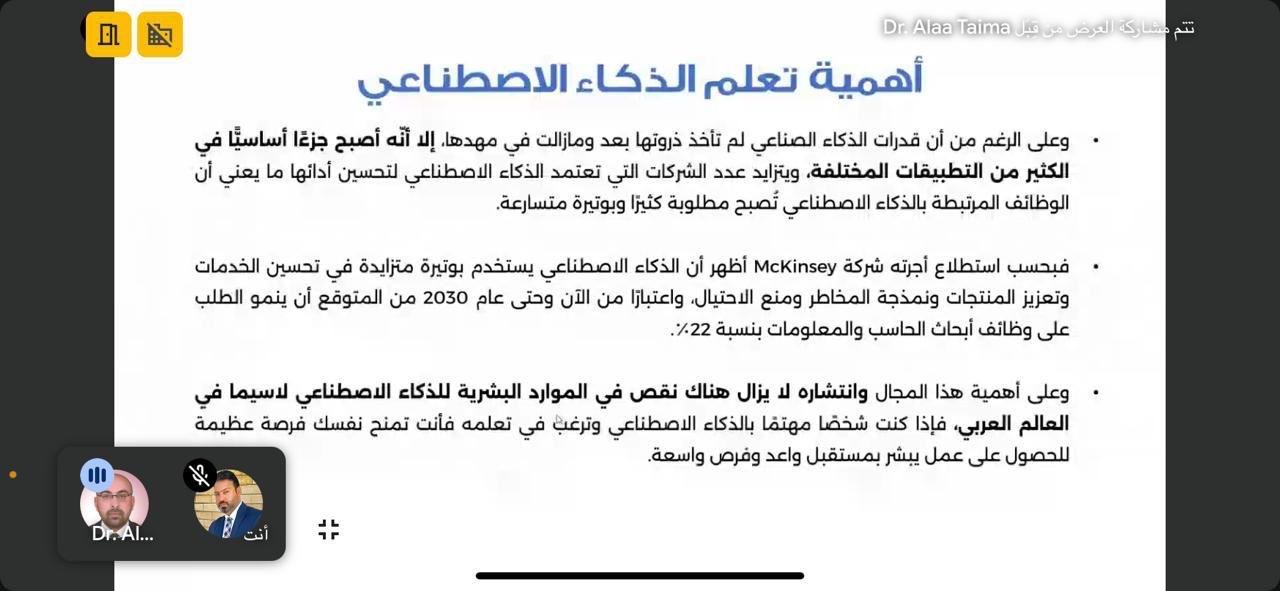 The Ibn Sina Center for E-Learning at the University of Basrah organized a workshop entitled Artificial Intelligence and its Uses in Cybersecurity. The workshop, which was held online, included a presentation of how artificial intelligence is used to detect cyber threats, predict attacks, enhance security measures, and explain how machine learning algorithms are trained to recognize malicious programs such as viruses and malicious links. The workshop highlighted the future possibilities of artificial intelligence and machine learning in the field of cybersecurity by creating independent security systems that operate without human intervention, in addition to analyzing data from various sources. The workshop aims to make artificial intelligence a crucial element in cybersecurity and enhance technical defense mechanisms to detect electronic threats and predict the behavior of malware.