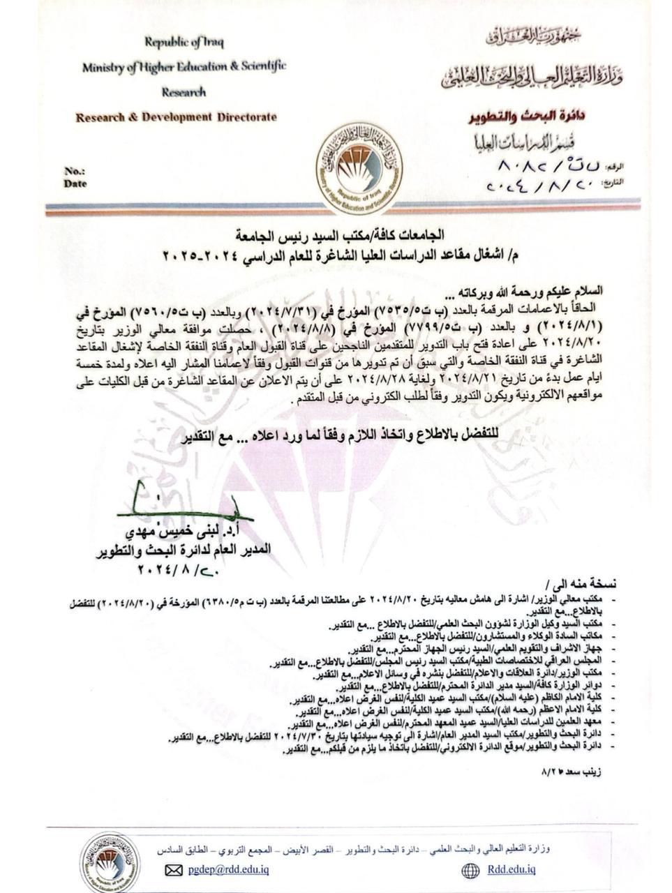 For successful postgraduate applicants for the academic year (2024-2025) who wish to rotate through the channels indicated in the attached Ministry letter, we would like to inform you that the service of sending rotation requests between vacant seats has been opened through your electronic accounts in the application and acceptance system, provided that the submitted requests are according to the timings indicated in the Ministry letter below, with the necessity of reviewing the Postgraduate Affairs Department in the college for the purpose of submitting paper requests and pledges for rotation directly after completing the electronic rotation request procedures.