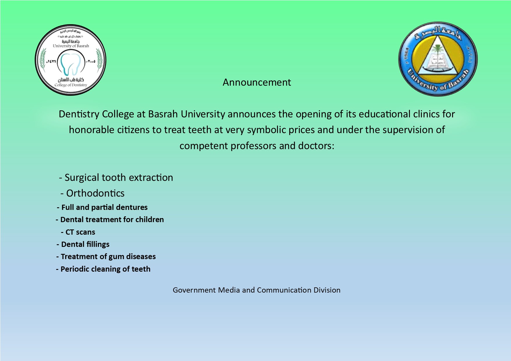 The College of Dentistry announces the opening of its educational clinics to honorable citizens