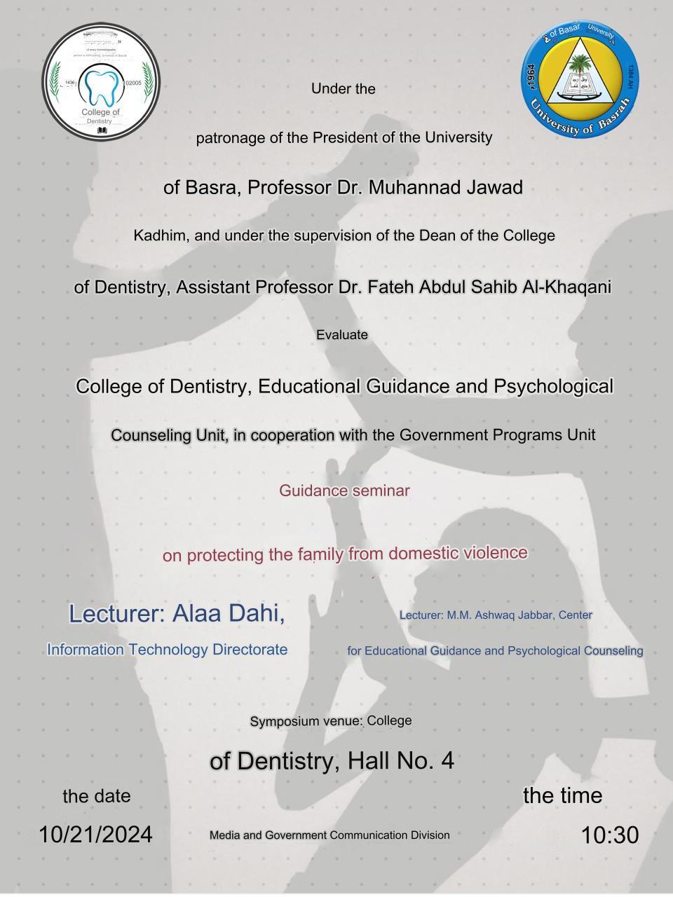 The College of Dentistry, in cooperation with the Educational Guidance Unit, will hold a guidance seminar entitled (Protecting the Family from Domestic Violence).