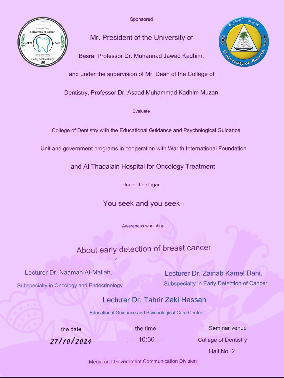 The College of Dentistry, in cooperation with the Educational Guidance and Psychological Counseling Unit, will hold an awareness workshop entitled (Early Detection of Breast Cancer).