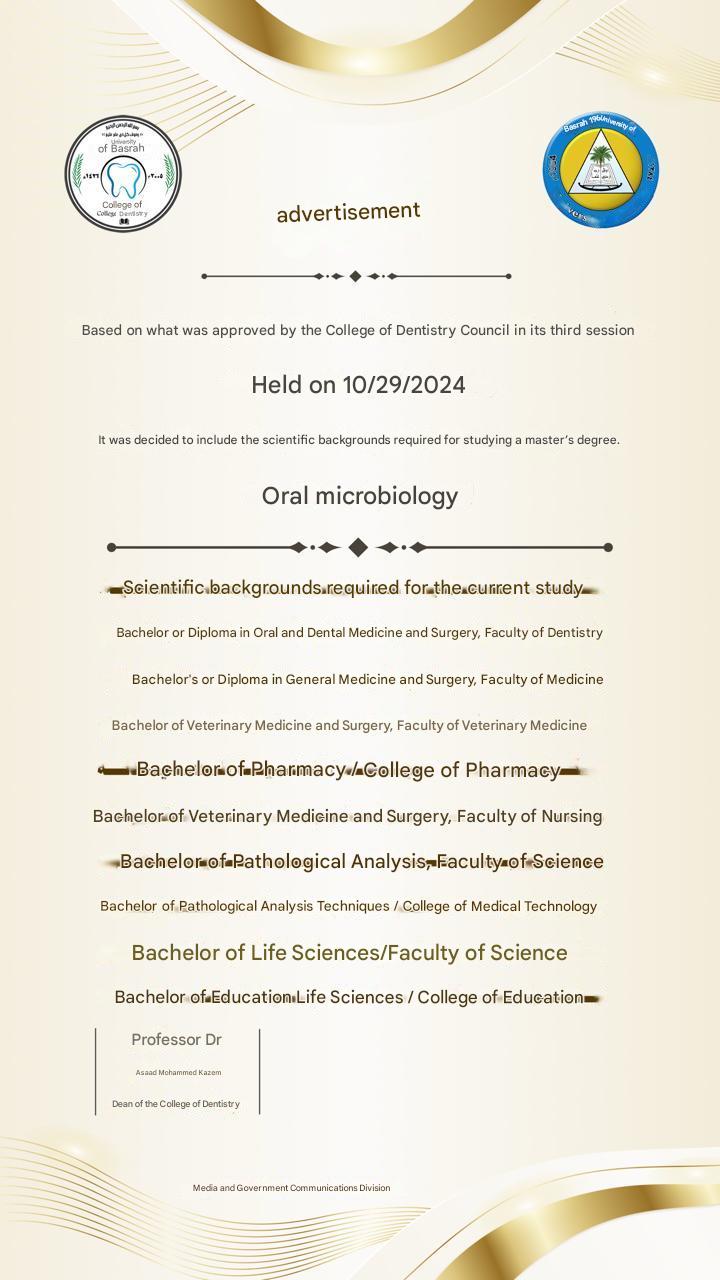 Announcement of the scientific backgrounds required to study the Master of Oral Microbiology at the College of Dentistry