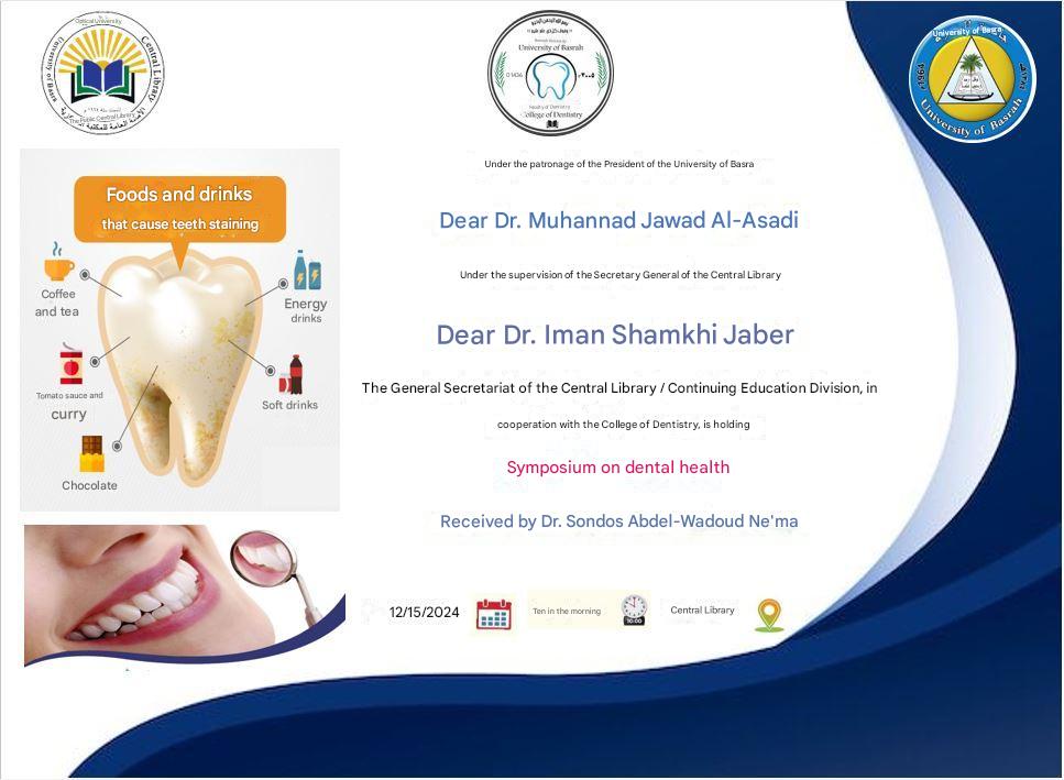 The College of Dentistry, in cooperation with the General Secretariat of the Central Library / Continuing Education Division, will hold a symposium entitled (Dental Health).