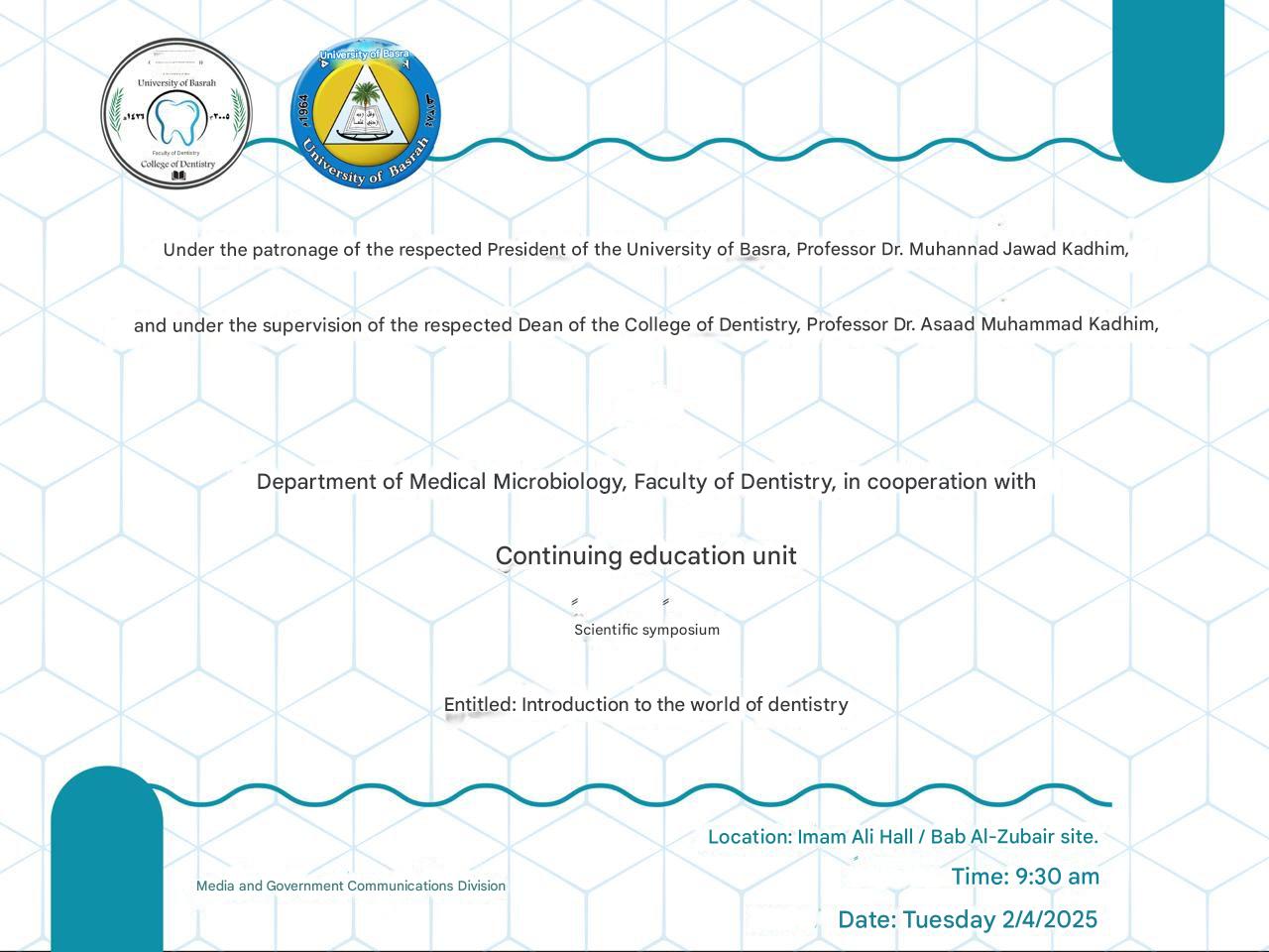 The College of Dentistry, in cooperation with the Continuing Education Unit, will hold a scientific symposium entitled (Introduction to the World of Dentistry).