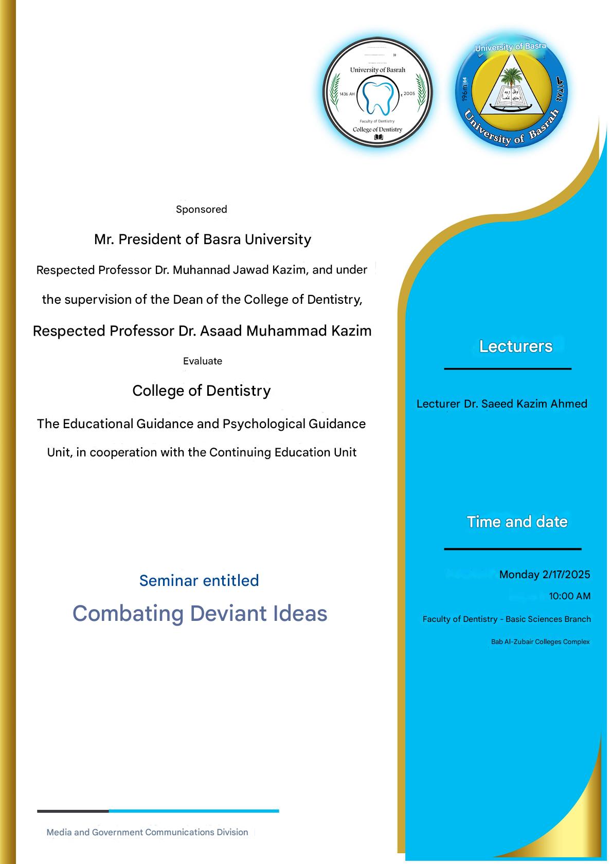 The College of Dentistry, the Educational Guidance Unit and the Continuing Education Unit are holding a symposium entitled Combating Deviant Ideas.
