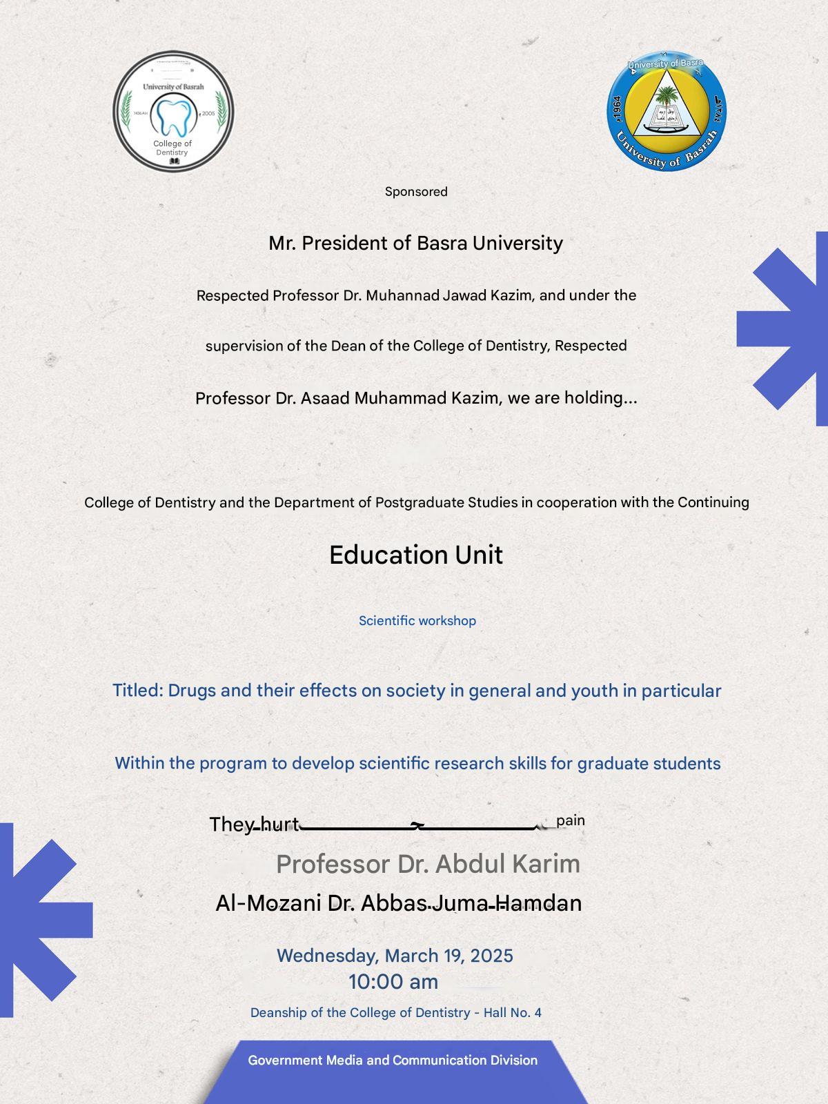 The College of Dentistry, in cooperation with the Graduate Studies Division and the Continuing Education Unit, will hold a scientific workshop entitled (Drugs and their effects on society in general and youth in particular).