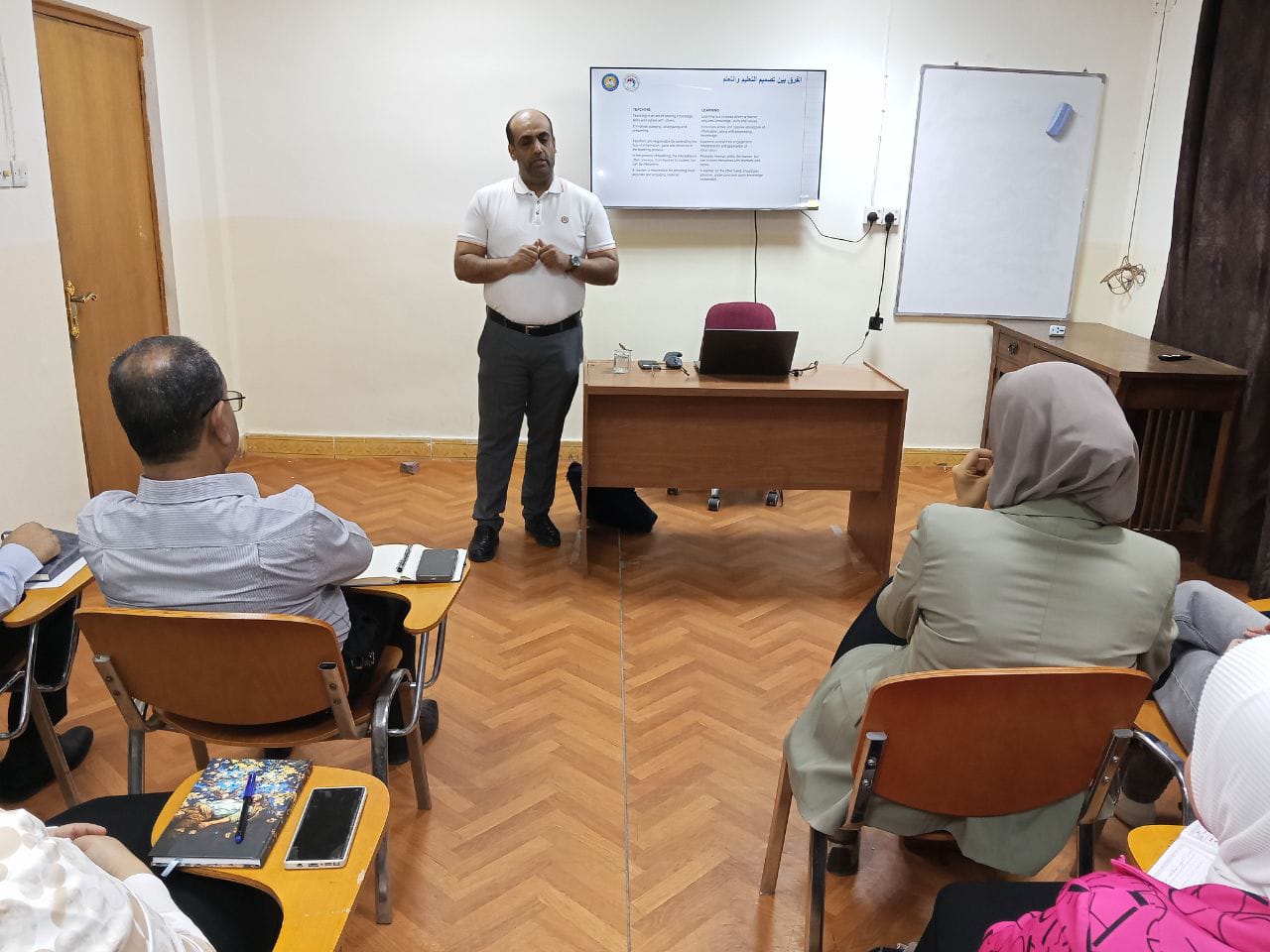 Delivered by Dr. Oday Basheer Issa, the lecture included an introduction to learning design, an explanation of Bloom’s taxonomy and its levels, methods of formulating objectives and deriving them from different sources, as well as a discussion of various learning types such as acquisition, discussion, exercises, production, and collaboration. The session also introduced tools and websites for learning design and their applications, along with practical activities.