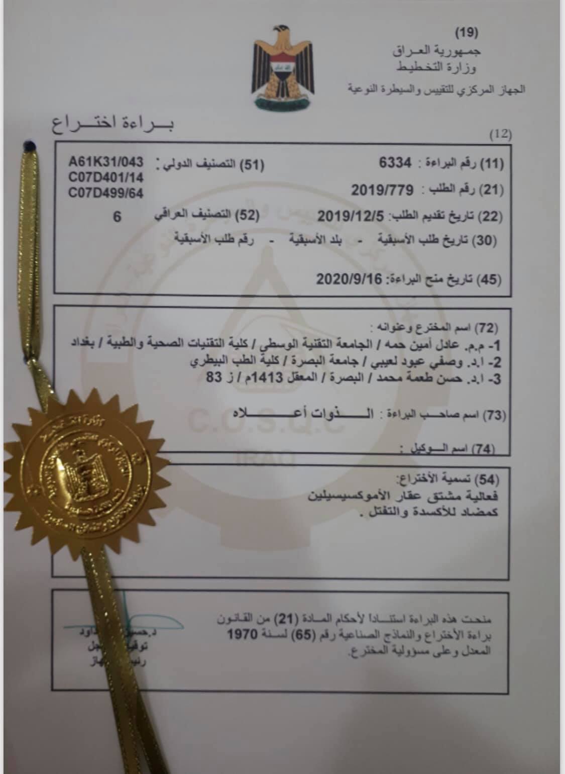 The Joint patent, which granted by the Central Organization for Standardization and Quality Control Unit of the Ministry of Planning, reviewed modifying the chemical composition of Amoxicillin and to conduct experiments and tests to demonstrate their effectiveness as an antioxidant inside and outside the cells using laboratory rats.