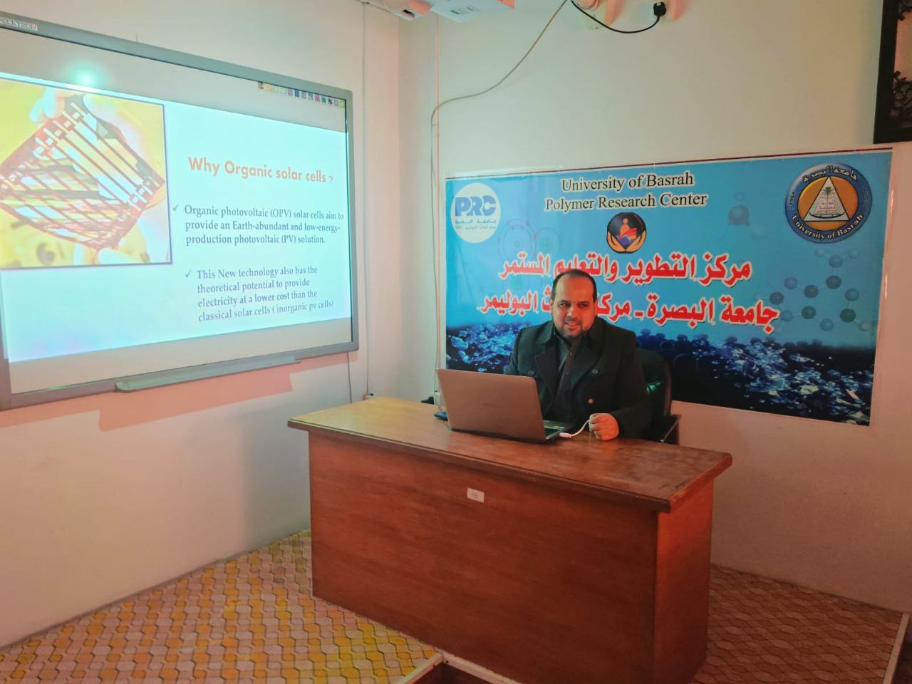 The workshop, presented by Dr. Abdullah A. H, focused on organic solar cells, a branch of modern renewable energy technology. Organic solar cells rely on organic materials (polymers or carbon molecules) capable of absorbing light and converting it into electrical energy. These cells are characterized by their light weight, flexibility, and lower manufacturing costs compared to traditional silicon-based solar cells.