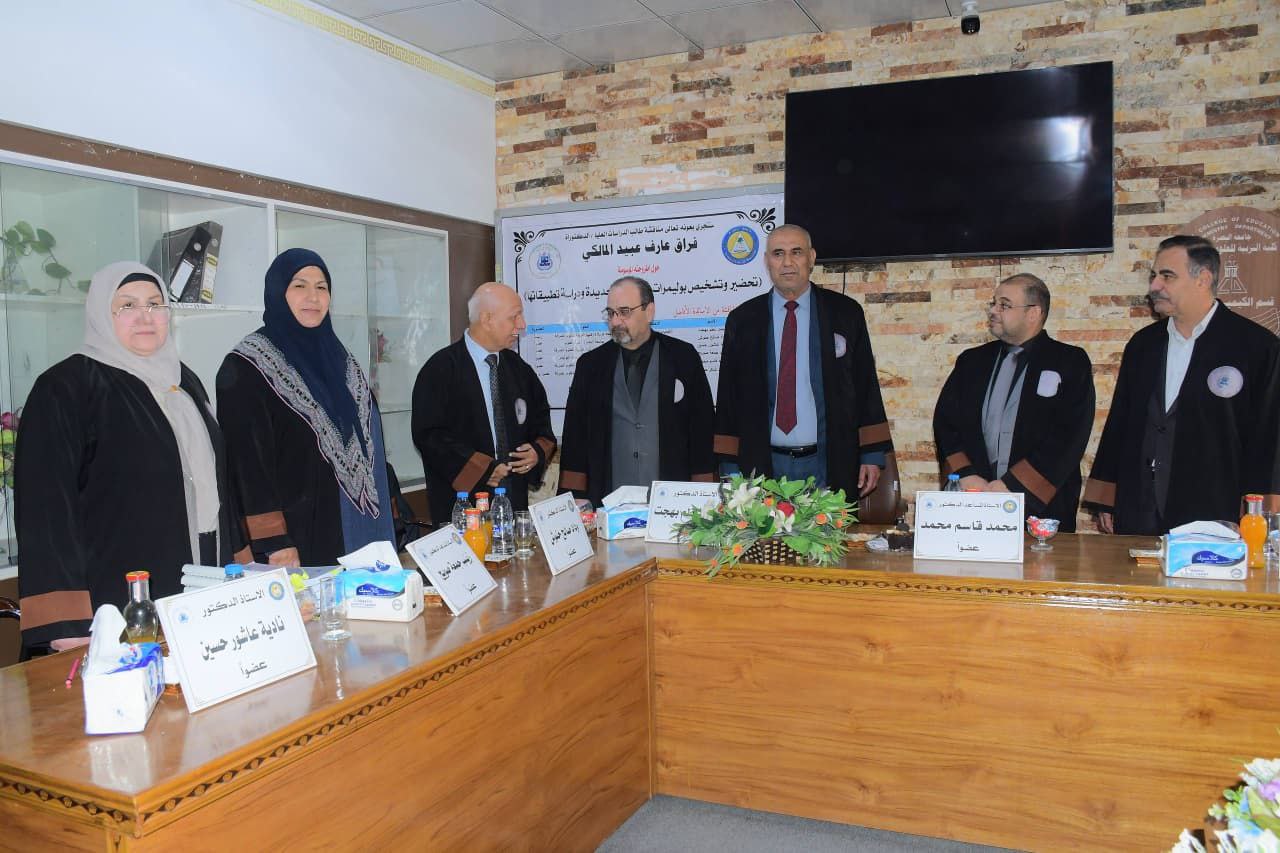 Dr. Zainab J.S, a faculty member at the Polymer Research Center/University of Basra, participated as a member of the committee that examined the doctoral dissertation of student Faraq Arif Ubaid, entitled "Preparation and Study of Novel Copolymers and Their Applications." The researcher prepared a group of monomers and copolymers, which were characterized using various techniques, including FTIR C.H.N and H1-NMR, providing precise information about their structural composition. The properties of all the prepared materials were evaluated by calculating their critical micelle concentrations (CMCs) using electrical conductivity to understand their aggregation behavior in aqueous media. The prepared materials demonstrated their suitability for use as emulsifying agents or surfactants. The scientific discussion took place in a rigorous academic atmosphere, enriched by scientific observations that contributed to enhancing the research's scientific value. At the conclusion of the discussion, the committee decided to accept the thesis after making the required modifications, wishing the student continued success in his academic career.