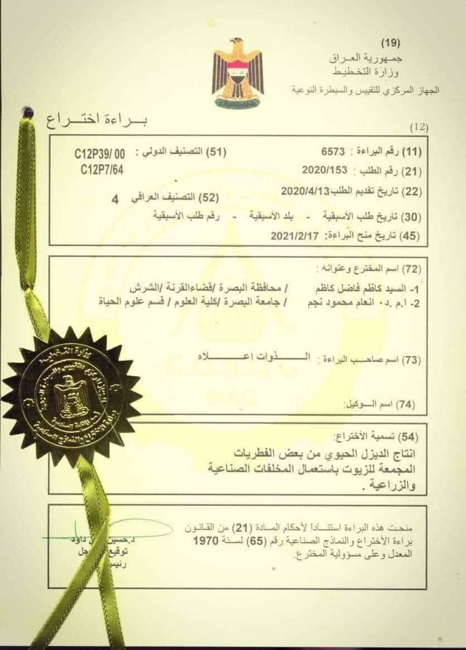 A research team in university of Basrah - college of Science, consists of Dr. Inaam Mahmoud Najim In cooperation with asst. teacher Kadhim Fadhil Kadhim Al_Raheem from college of Education - Qurnah obtained a patent for producing biodiesel from local oleaginous fungi isolates using low-cost fermentation medium of agricultural and industrial waste and a US patent was obtained for it was used for the first time