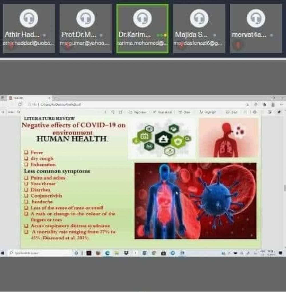 The lecture, presented by Dr. Karima Muhammad Abdullah Al-Absi, aimed to identify the positive and negative effects of COVID-19 on the environment and to give recommendations for working together to restore the environment