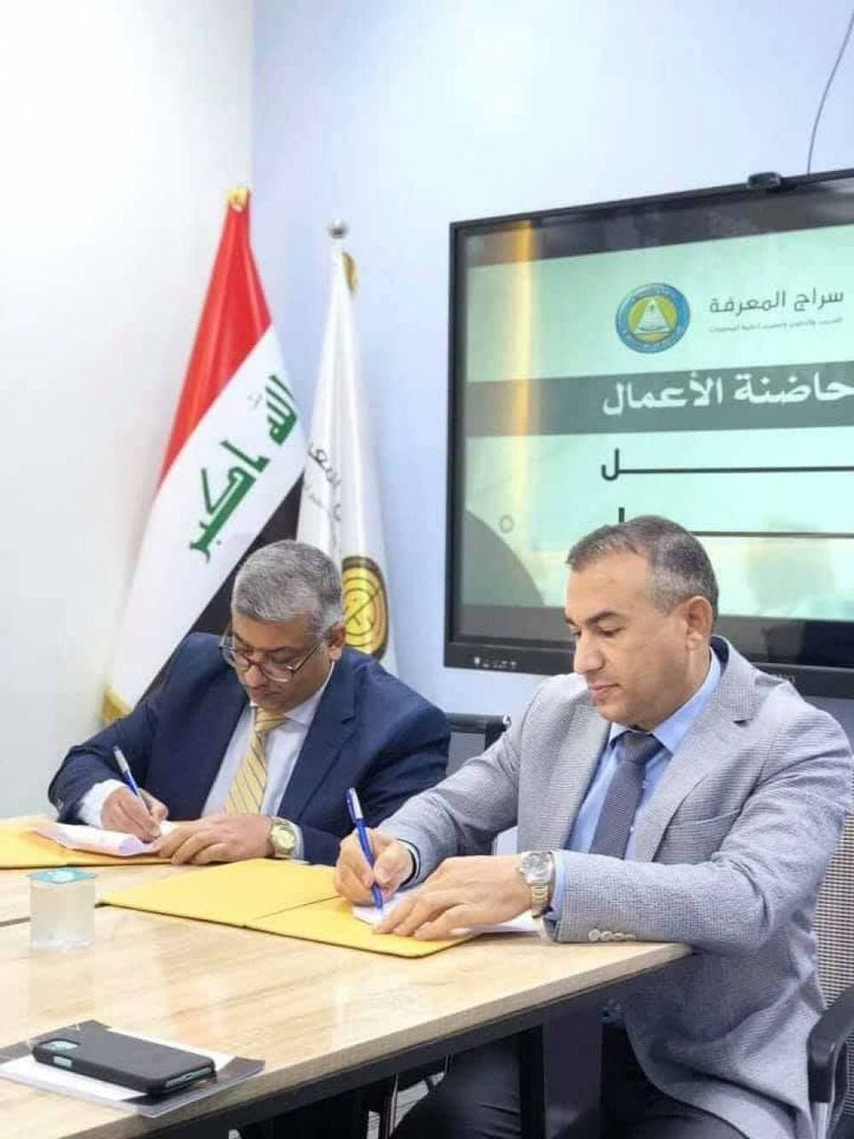 The Assistant Dean for Scientific Affairs of the College of Administration and Economics at University of Basrah, Dr. Ahmed Saddam, signed a memorandum of understanding with the managing director of Siraj Al-Marefa Company, Dr. Essam Younis Abdul-Zahra, to establish a business incubator for agricultural and economic projects