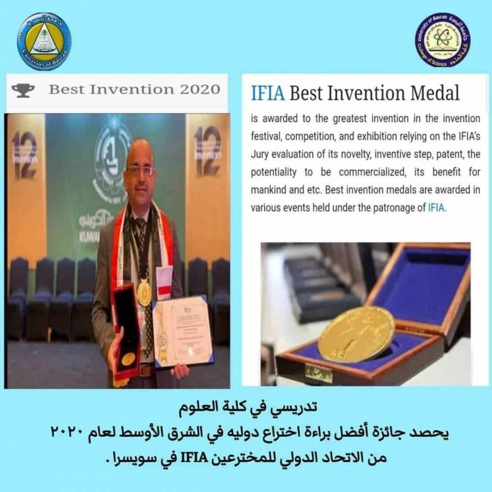 The instructor at the College of Science at University of Basrah, Dr. Salah Shakir Hashem, won the Best International Patent Award in the Middle East for the year 2020 from the International Federation of Inventors (IFIA) in Switzerland