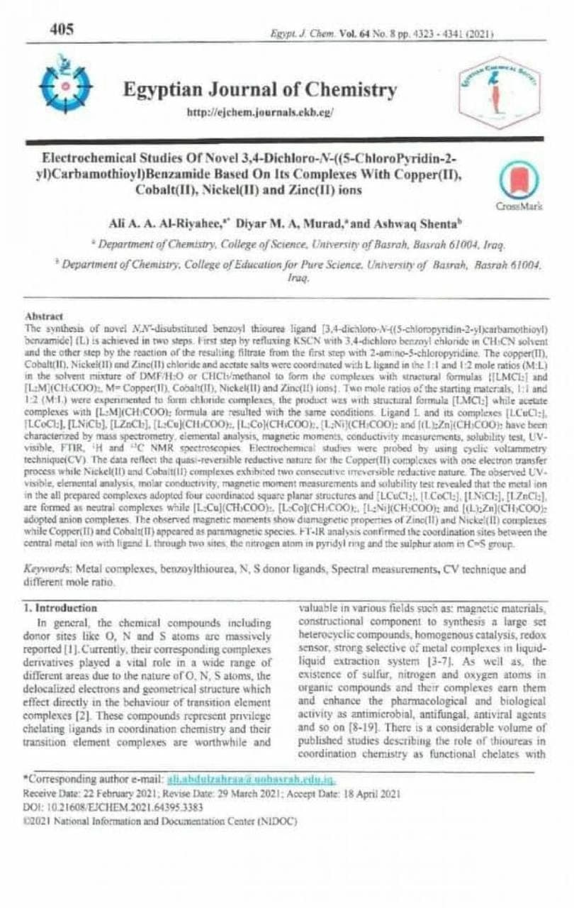 A scientific study prepared by a research team at the College of Science at University of Basrah, consisting of Dr. Ali Abdul-Imam Abdul-Zahra Al-Riyahi, researcher Diyar Muhammad Ali Murad, and Ashwaq Abboud Shanta, examined the publication of a research on the electrothermal applications of new benzamide derivatives in an international journal