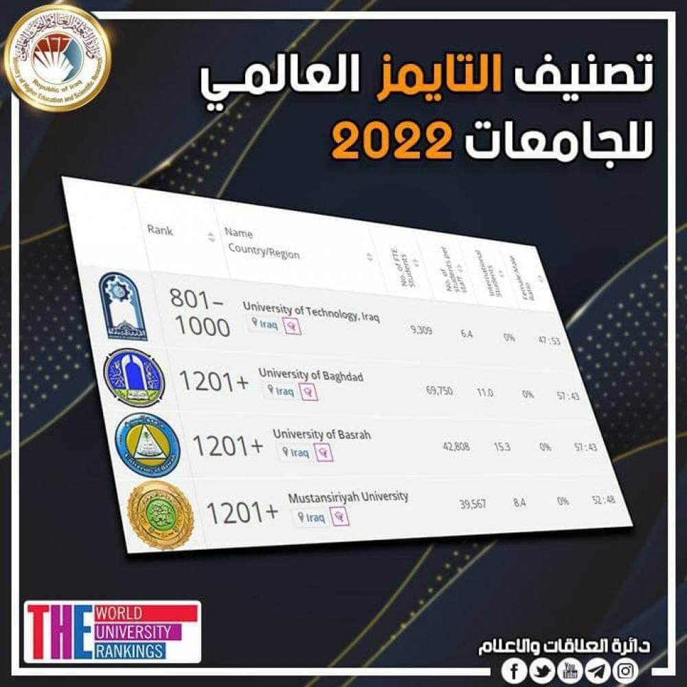 In confirmation of the international academic reputation and commitment to the requirements of quality and academic accreditation at the level of institutional and program performance, and in implementation of the policy and methodology of the independence of university institutions, the Ministry of Higher Education and Scientific Research announces that the Iraqi universities have been able and succeeded in enhancing their position in the international classifications, as the universities of technology, Baghdad, Basrah and Al-Mustansiriya achieved advanced competitive positions within the results of the Times global classification edition of 2022, which ranked more than 1,600 universities from 99 countries