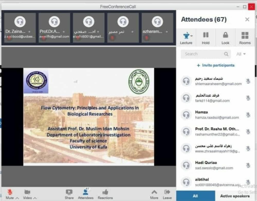 The lecture, which was presented by Dr. Muslim Idan Mohsen from the Department of Pathological Analysis at the College of Science - University of Kufa, included a statement of the importance of the flow cytometry device in biological sciences and modern techniques for measuring the level of protein present in vital cells as well as the level of protein expression in the surface of cells, and this gives a great impression for the detection of diseases and immune and cancer markers through the use of this technique