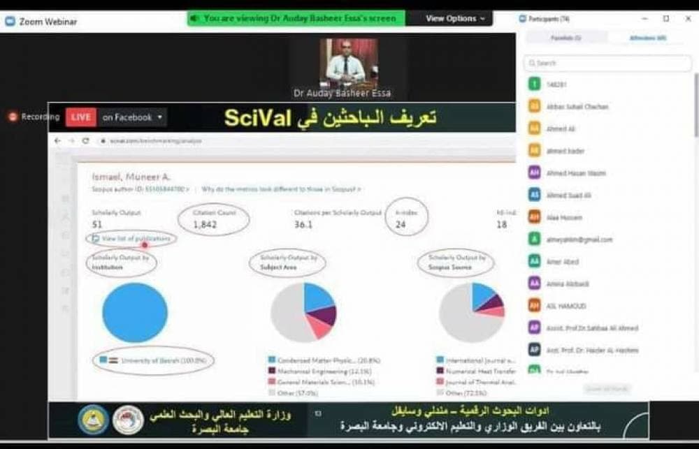 The Avicenna Center for E-Learning at the University of Basrah, in cooperation with the Ministerial Team for E-Learning, organized an electronic workshop on digital research tools - Mandali and Scival as a model, with the participation of leaders and instructors from different Iraqi universities