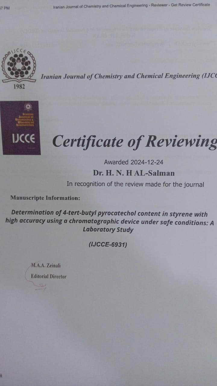Dr. Hussein Nasser said that the journal is concerned with chemistry and chemical engineering. We were honored for evaluating the research entitled (Determination of the content of 4-tert-butylpyrocatechol in styrene with high accuracy using a chromatographic device under safe conditions: a laboratory study).