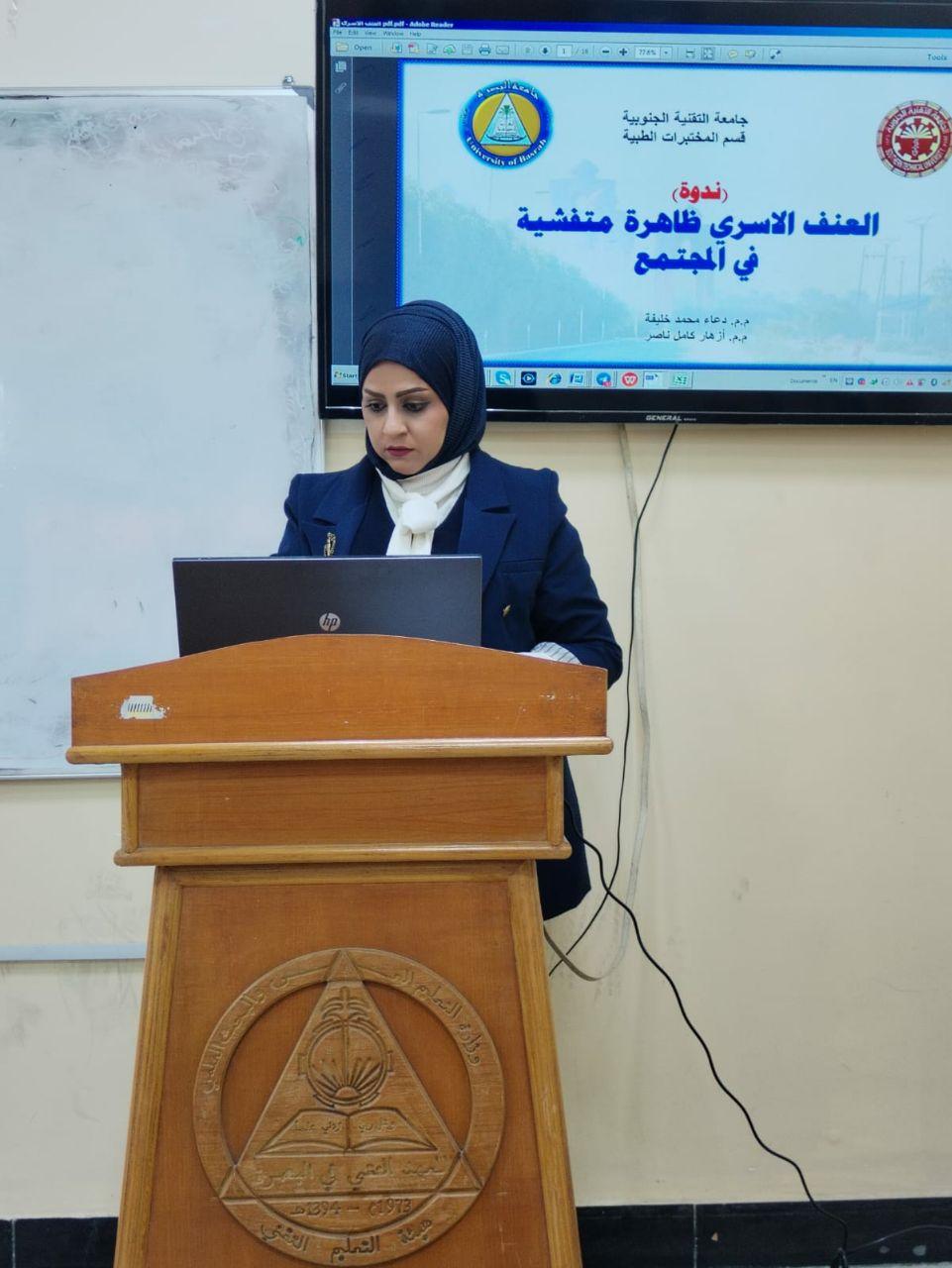 A lecturer at the College of Marine Sciences at the University of Basrah, Azhar Kamel Nasser, participated in managing a symposium entitled "Domestic Violence is a Widespread Phenomenon in Society", which was organized by the Department of Medical Laboratories at the Technical Medical Institute.