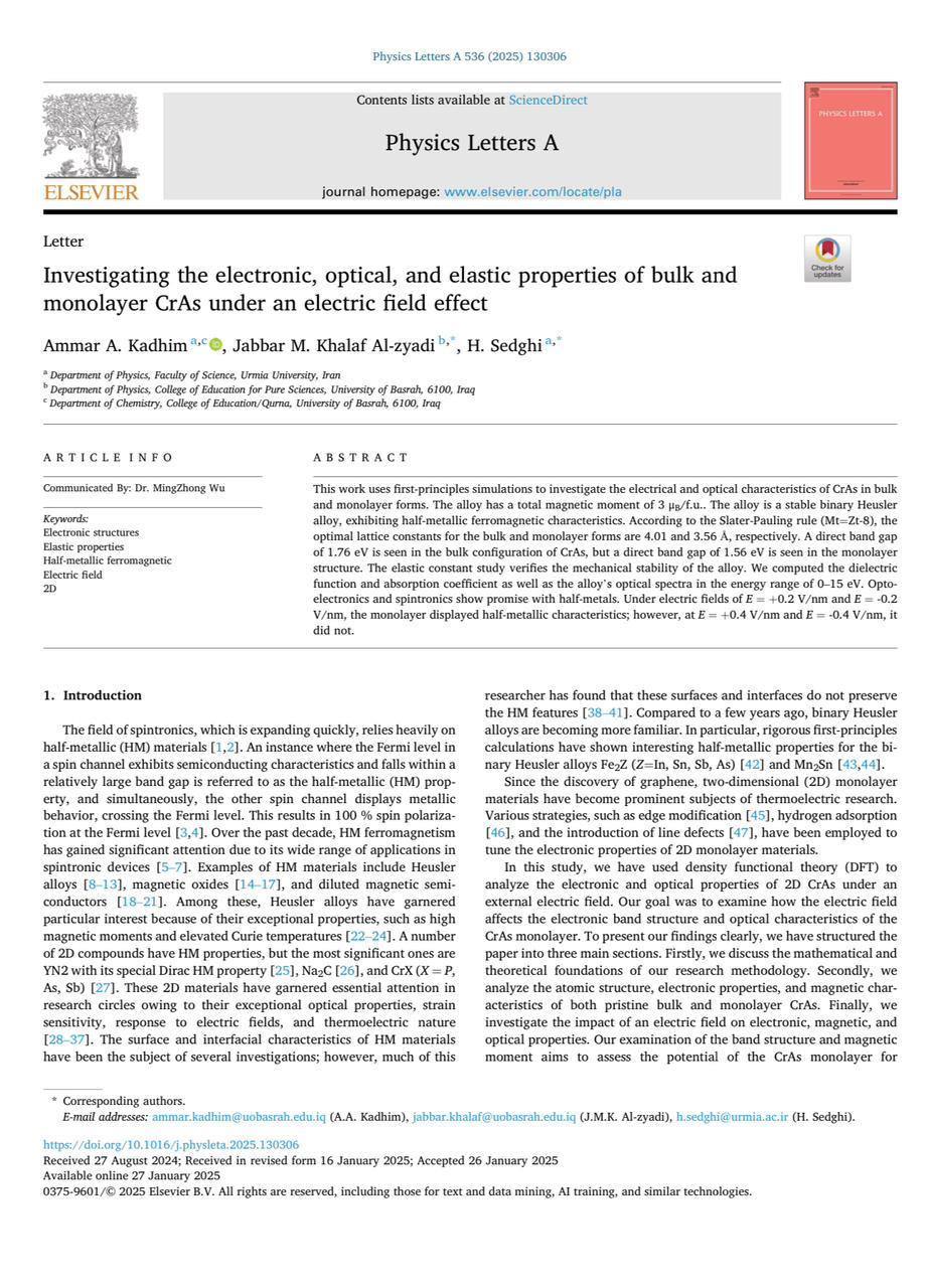 A scientific study prepared by Ammar Abdul Jabbar Kazim at the Faculty of Education of Qurna, University of Basra, investigated the electronic, optical and elastic properties of bulk and monolayer CrAs under the influence of an electric field.