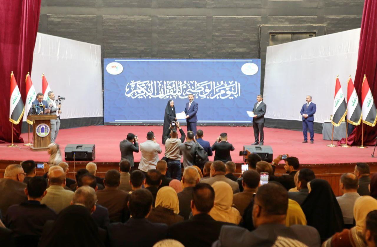 The celebration included official speeches, prayers, an exhibition of Arabic calligraphy and honoring a number of Holy Quran reciters and students admitted to the Holy Quran memorization channel in Iraqi universities.