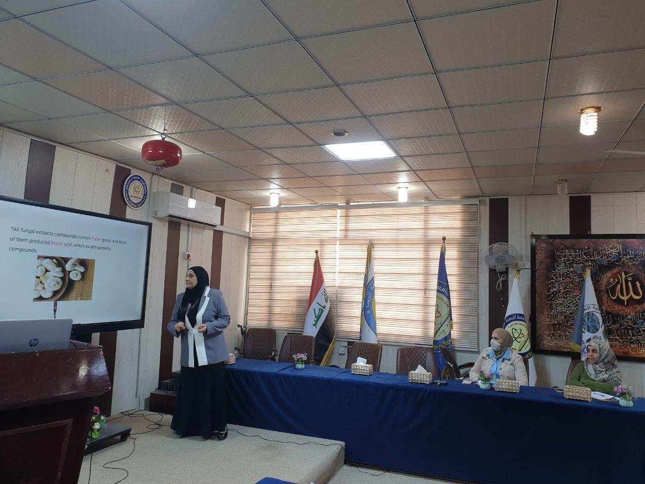 The workshop, presented by Dr. Aseel Abdul-Hamid Abdul-Karim, showed that white fungi with the scientific name Agaricus bisporus have therapeutic importance in inhibiting the Leishmania parasite, and that extracts isolated from white fungi can be used as an alternative drug to the standard treatment known as Pentostam, especially since the latter is considered one of the highly toxic pentavalent antimonials groups.
