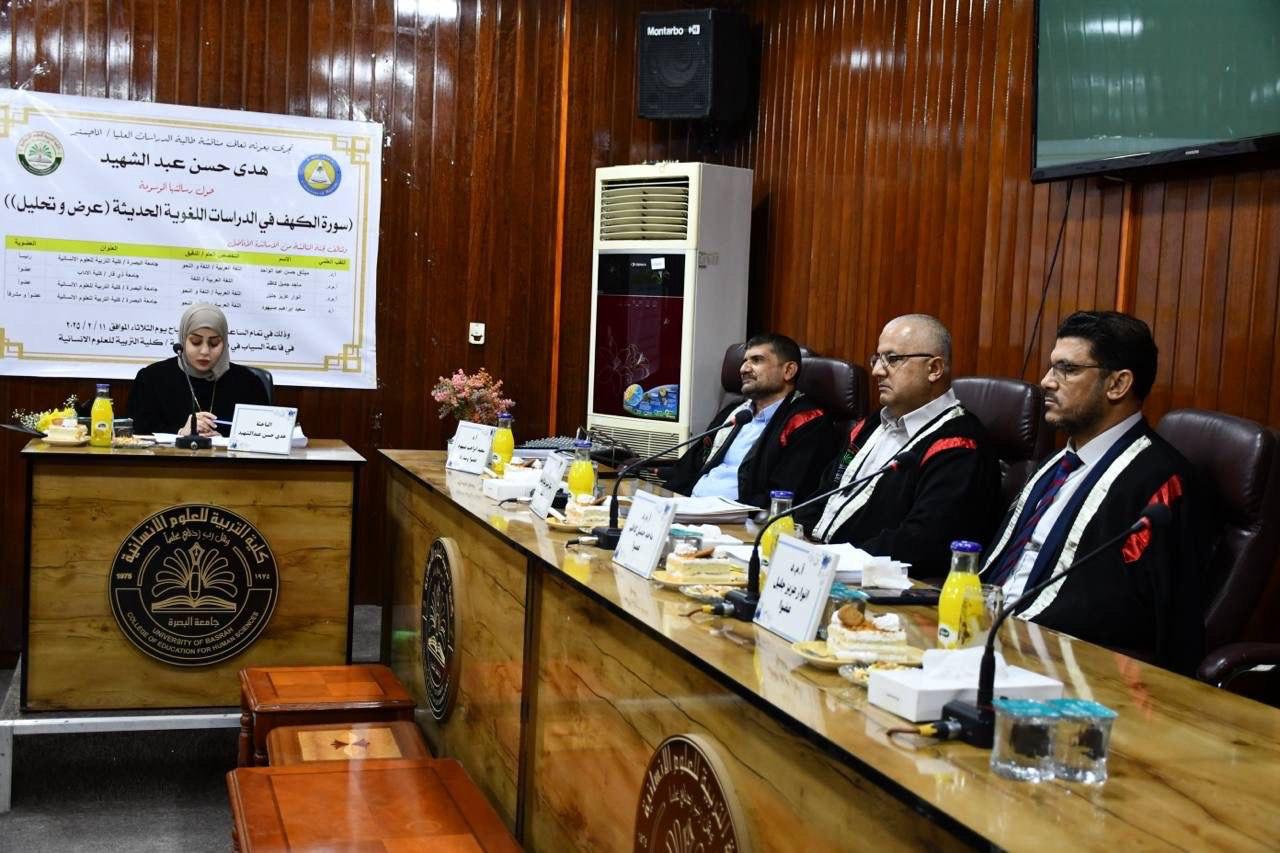 The thesis, presented by student Huda Hassan Abdul-Shaheid, aimed to re-read the studies that addressed Surat Al-Kahf (presentation and analysis) in light of language theory at its various levels (phonetic, morphological, syntactic, and semantic).