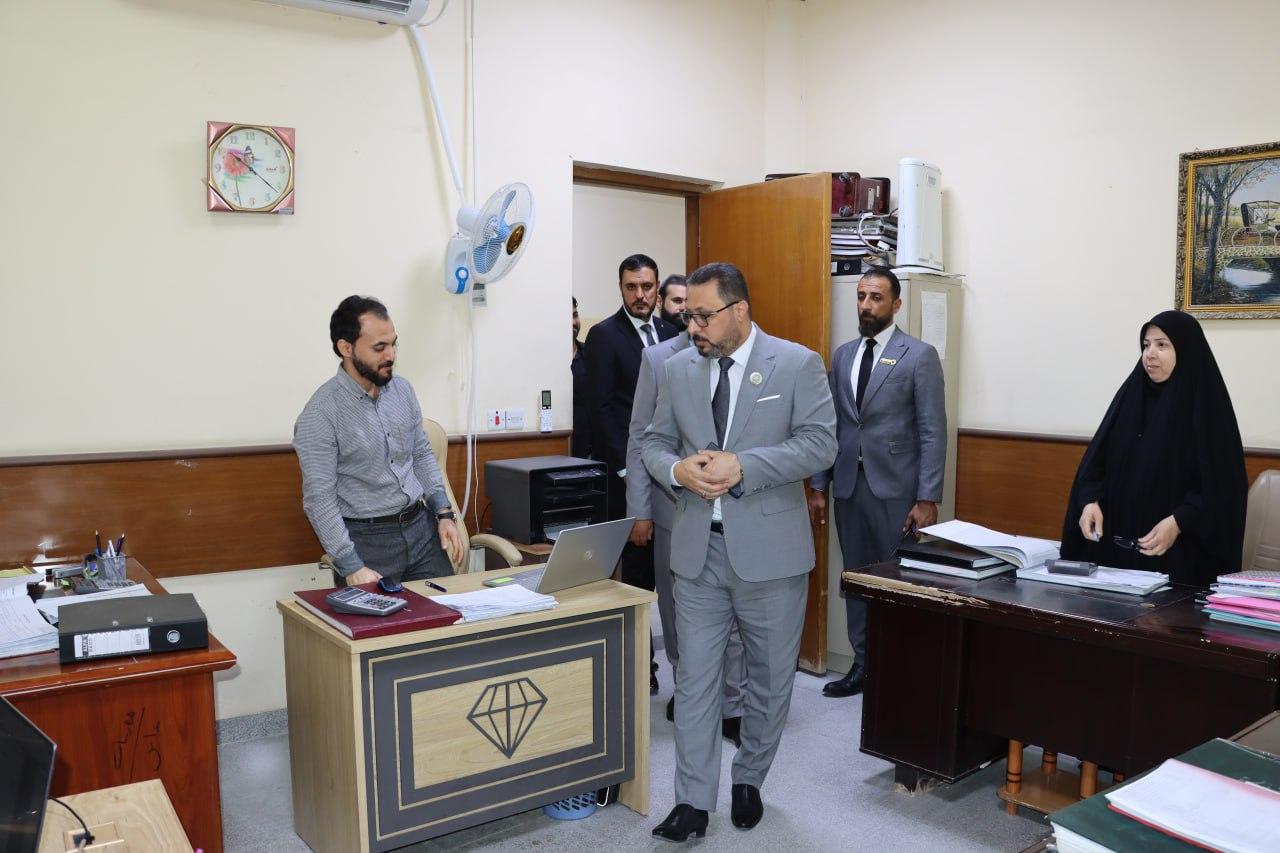 The President of the University of Basra, Dr. Muhannad Jawad Kazim, accompanied by his assistant for administrative affairs, Dr. Ayman Saleh Ne’ma, inspected the administrative, financial and legal departments in the presidency building to identify the needs and address some issues.