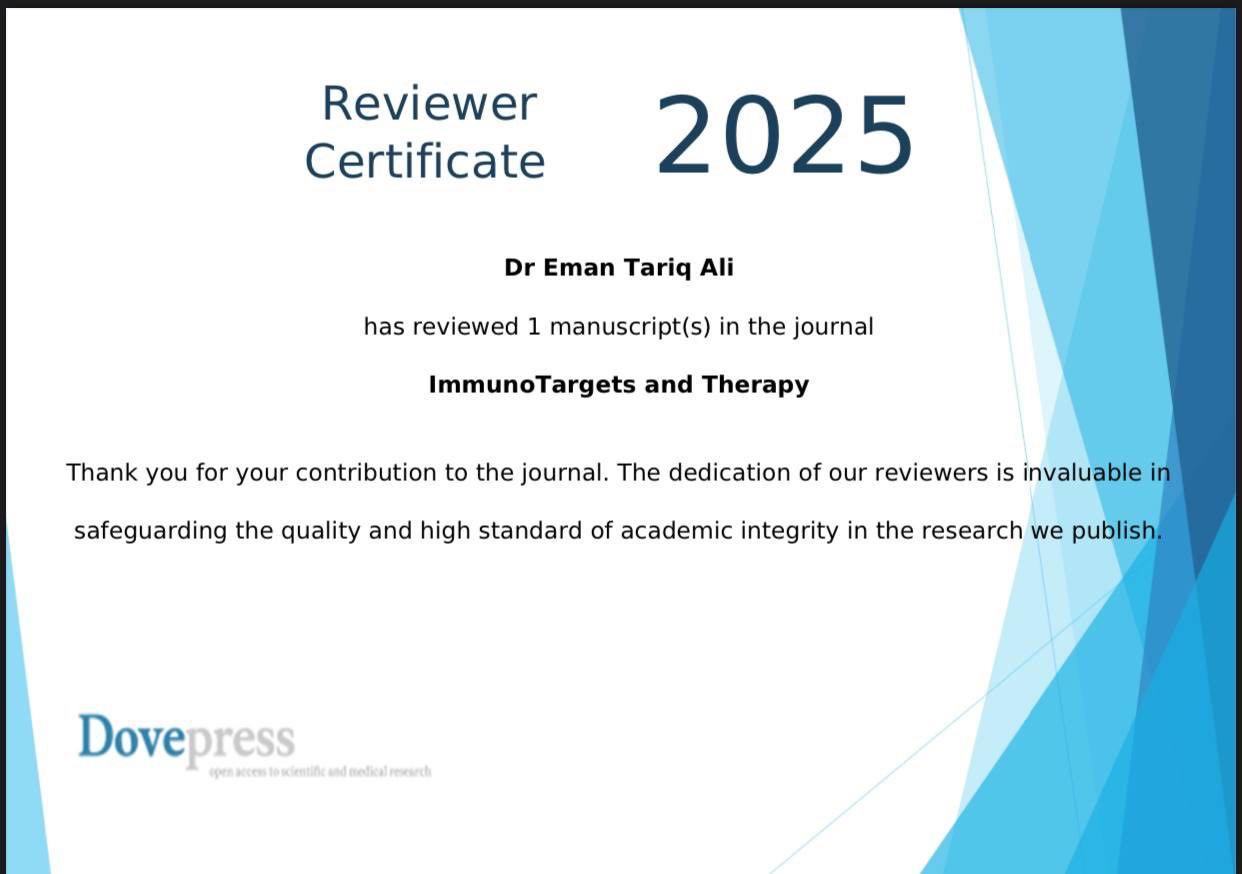Dr. Iman Tariq Ali Al-Ahmad, a lecturer at the College of Pharmacy at the University of Basrah, was selected as a scientific reviewer for the journal "Immuno Targets and Therapy."