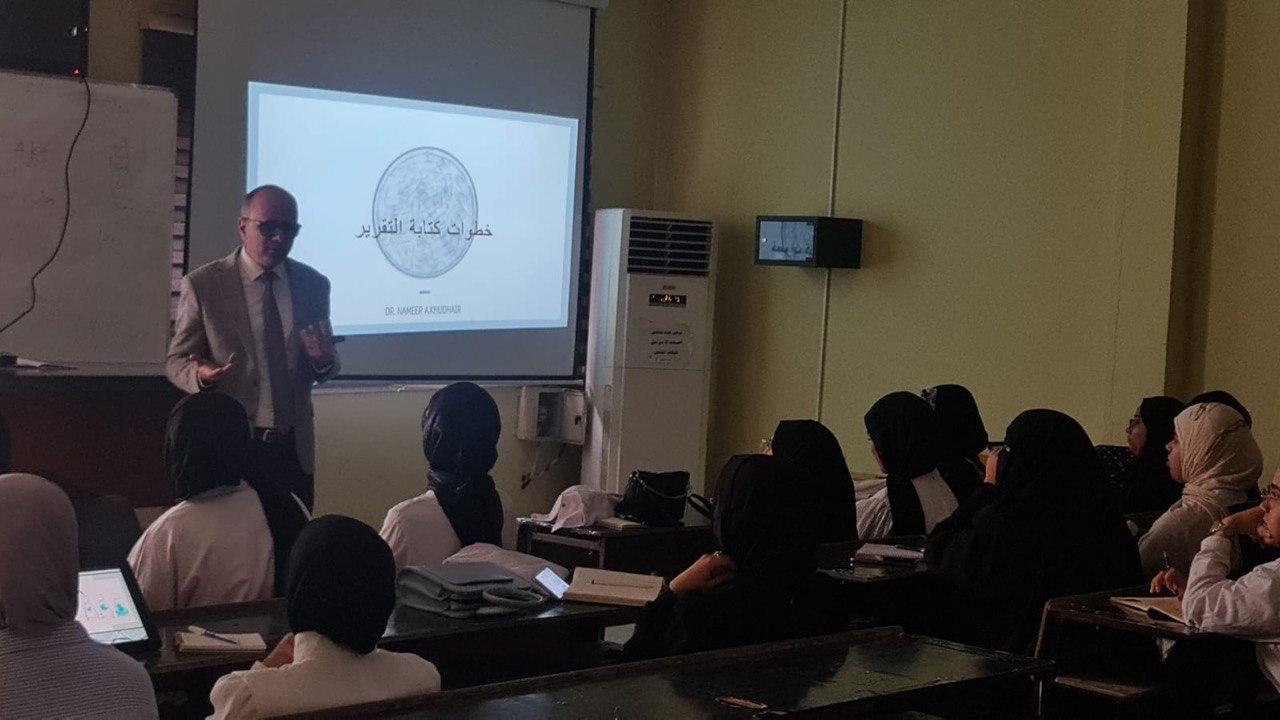 The lecture, delivered by Dr. Namir Abdul-Karim Khudhair, included a definition of the report, its importance in proving the facts of a specific topic, and the method of selecting and defining its objectives to serve the required scientific material. It also explained the elements of the report and what each element includes to achieve a scientifically beneficial report that will positively impact all students' knowledge.