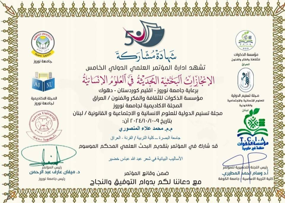 A lecturer at College of Education of Al-Qurna at University of Basrah, Muhammad Alaa Al-Mansouri, participated in the fifth international scientific conference, with the slogan "Modern Research Achievements in the Humanities," which was held by Nawroz University in Dohuk Governorate.