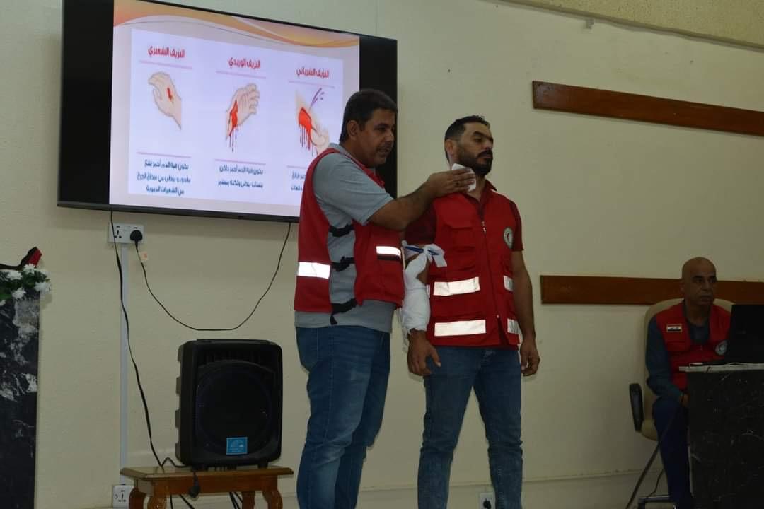 The course included lectures by paramedics Mr. Zain Al-Aabideen Hasan Ali and Mr. Qusay Abdullah Khudair. They discussed the role of the society during times of peace and war in providing first aid, the key procedures followed by paramedics in emergencies and disasters, the importance of swift action, the need to record the history and type of injury, and how to diagnose its progression to prevent complications.