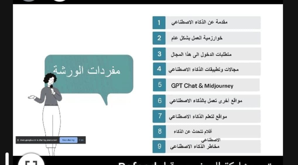 The workshop, in which the lecturer Rafid Muhammad lectured, included defining the term artificial intelligence, the history of its formation, uses, nature, application areas, and the websites that work with it.
