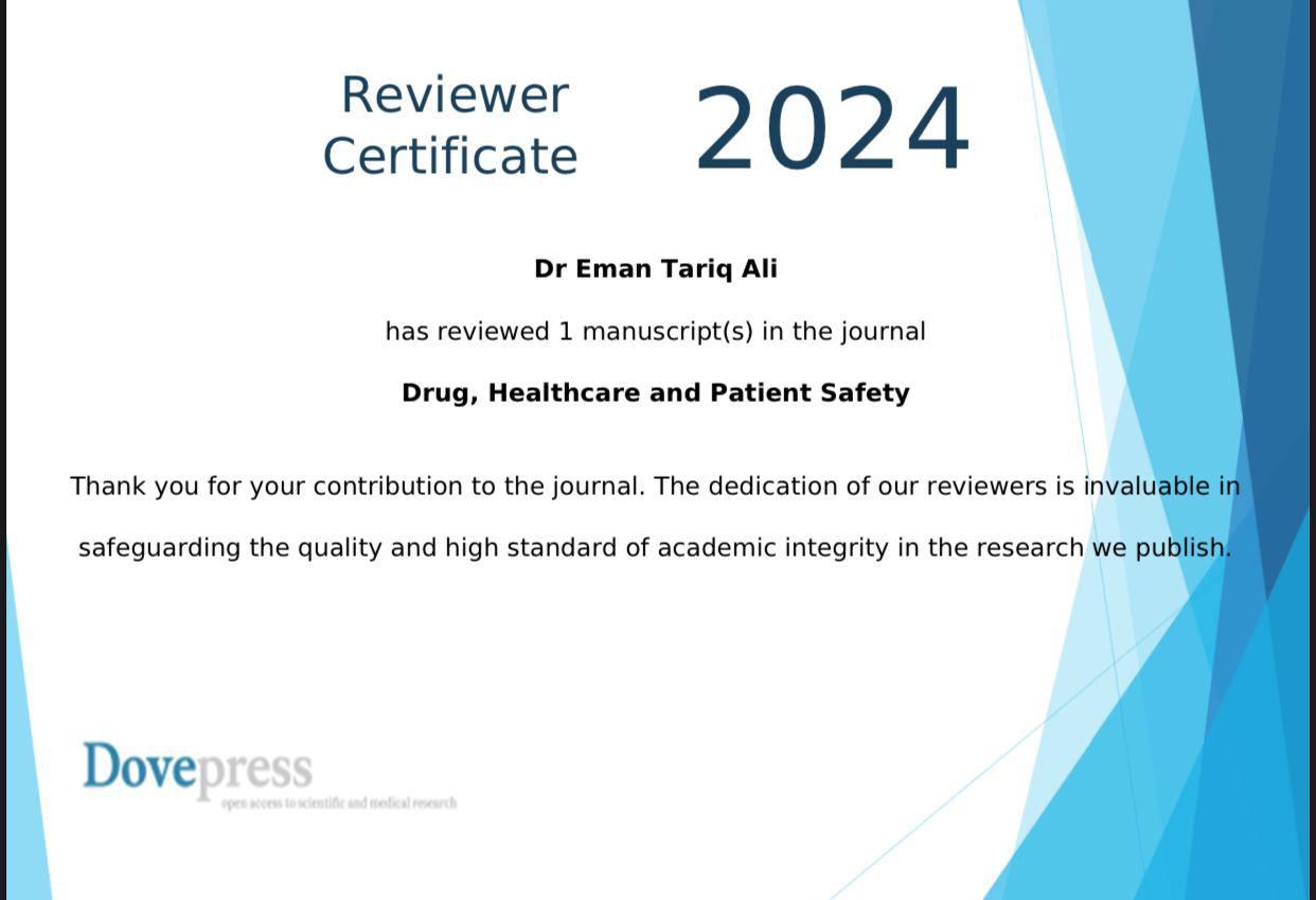 Dr. Iman Tariq Ali Al-Ahmad, a faculty member at the College of Pharmacy, University of Basrah, has been selected as a scientific reviewer for the journal "Drug, Healthcare and Patient Safety," which has an impact factor of 2.2 and is indexed in Scopus.