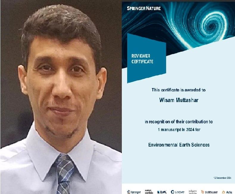 Dr. Wissam Razzaq Mutsher, a professor at the Marine Science Center of Basrah University, has been selected as a scientific reviewer for the journal "Environmental Earth Sciences."