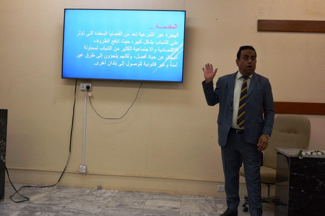 The symposium featured a presentation by Emad Al-Yasiri, a representative from the Human Rights Commission in Basra, discussing the concept of illegal immigration, its causes and consequences, and measures that can be taken to limit it.