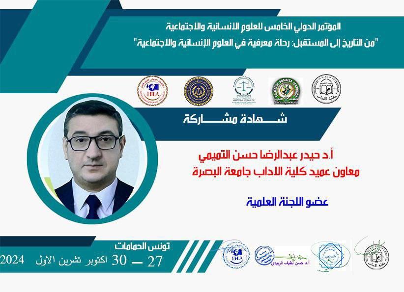 The Assistant Dean of the Faculty of Arts for Scientific Affairs, Dr. Haider Abdul Ridha Al-Tamimi, has been selected as a scientific evaluator at the Fifth International Conference on the Humanities.