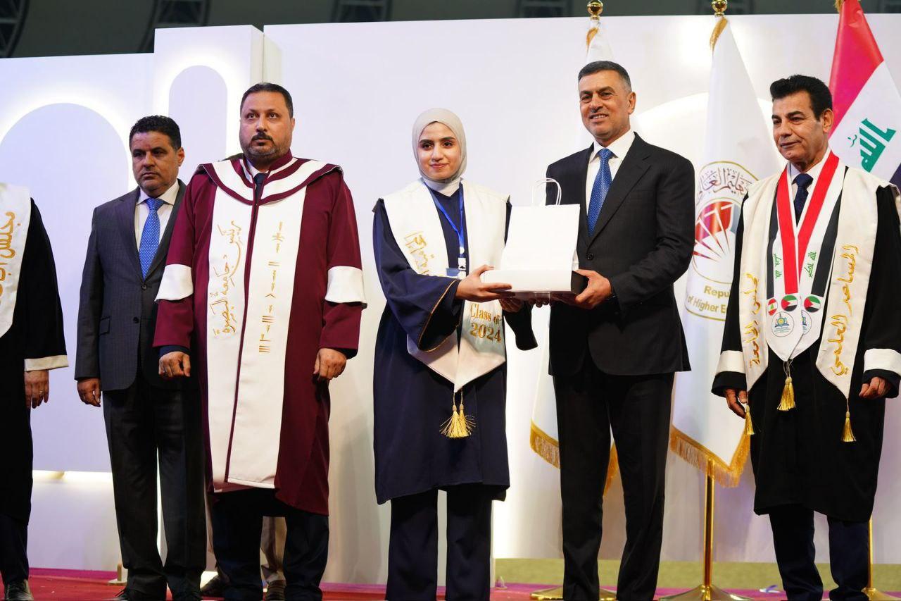 Dr. Muhaned Jawad Kazem, the President of Basrah University, honored the top student of the university for the academic year 2023-2024, Um Al-Baneen Mundher Hani, from the College of Law. The recognition took place during the central ceremony organized by the university for the graduation of its 57th cohort, themed "Science and Construction."